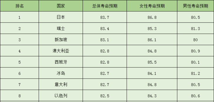 根据世界卫生组织(WHO)最新数据显示:日本国民平均预期寿命达到83.7岁,其中日本女性预期寿命更是高达86.8岁,位居世界首位长寿国家!