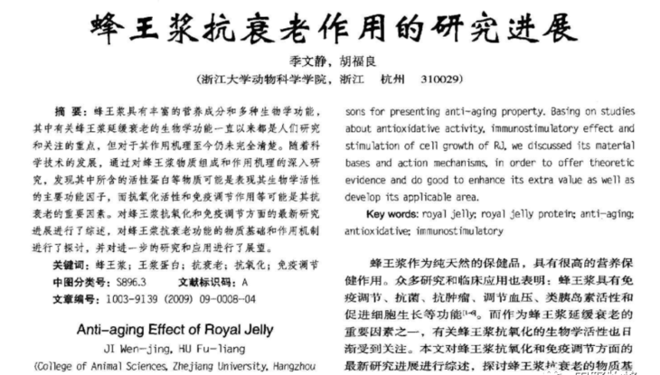 浙江大学胡福良教授,更是发表了《蜂王浆抗衰老作用的研究进展》期刊;