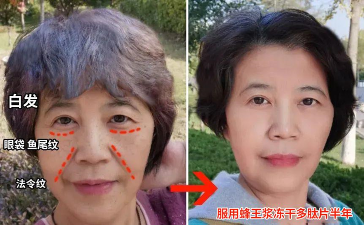 @湖北的陈女士:59岁了今年,头发已经灰白了,脸上各种很深的皱纹;去年去日本旅游的时候,买了十瓶蜂王浆冻干多肽片,全部吃完后,居然头发转黑、皱纹也消掉了不少,至少年轻了10岁不止。