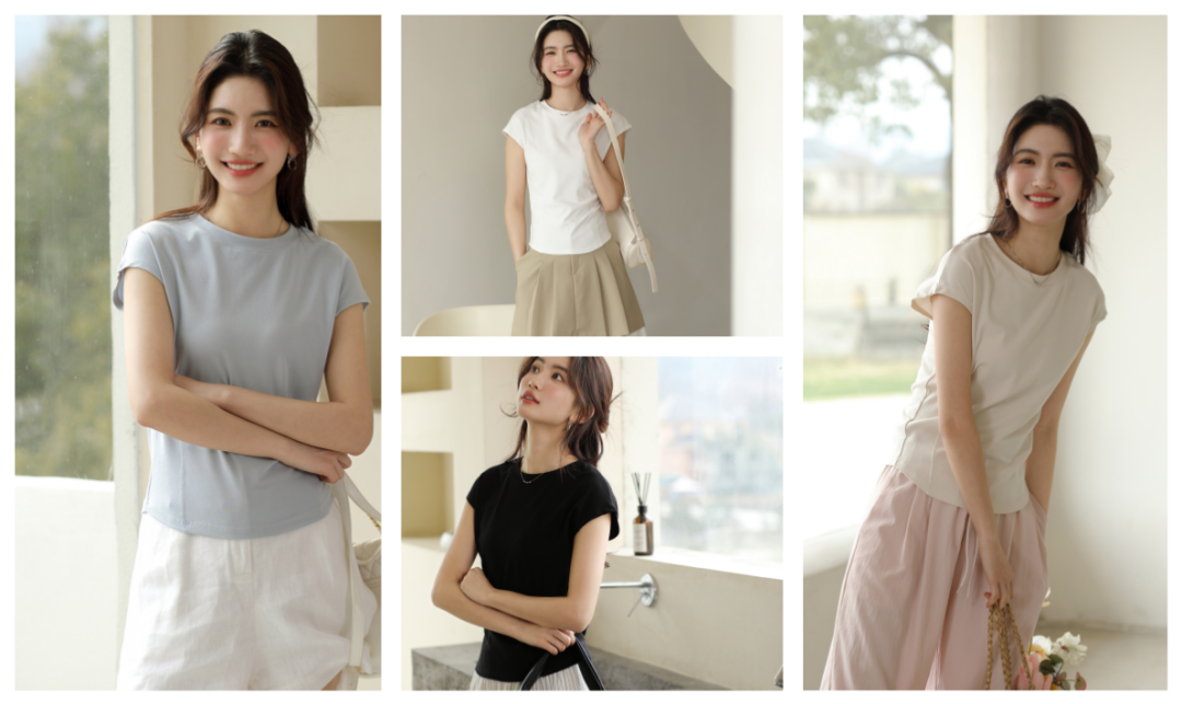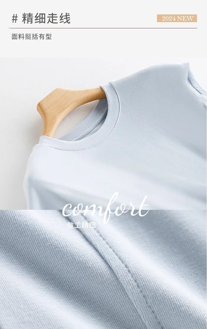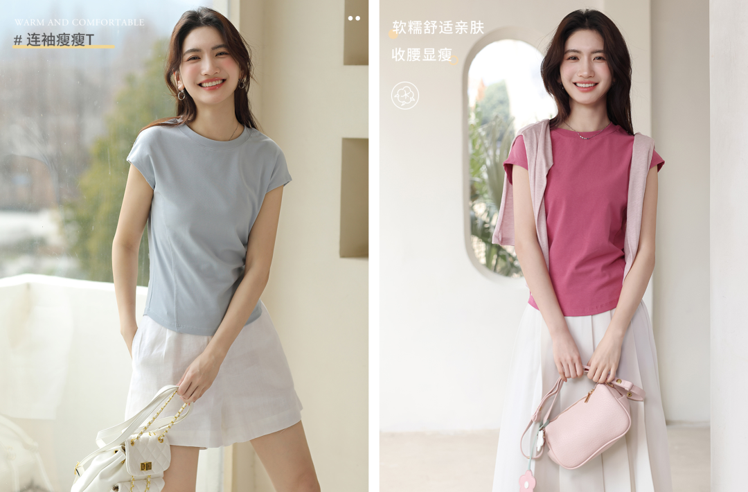 想要显瘦又遮肉,“无痛减肥”的?那不得不看我们的这款连袖瘦瘦T啦。轻盈的面料和独特的设计,让上身效果up up up!人棉与棉的科学配比混纺,保证了面料的亲肤透气性,也更注重面料的质感与上身的挺度。采用的是优可丝,它的吸湿性也非常好,使你在炎热的夏季也能保持干爽和舒适。在设计上,采用了流行的飞袖设计,不仅能够修饰手臂线条,还能在视觉上增加层次感和时尚感。短袖的设计则更加适合夏季穿着,展现出其休闲随性的风格。腰前侧还加了两条车缝线,视觉上立体了腰围曲线,使得身型更有“纸片人”效果。连袖上衣很百搭,无论撞色搭配还是顺色搭配,都活力满满,元气up。一件连袖瘦瘦T既能给你带来舒适的穿着体验,又能让你在人群中脱颖而出。» 04
