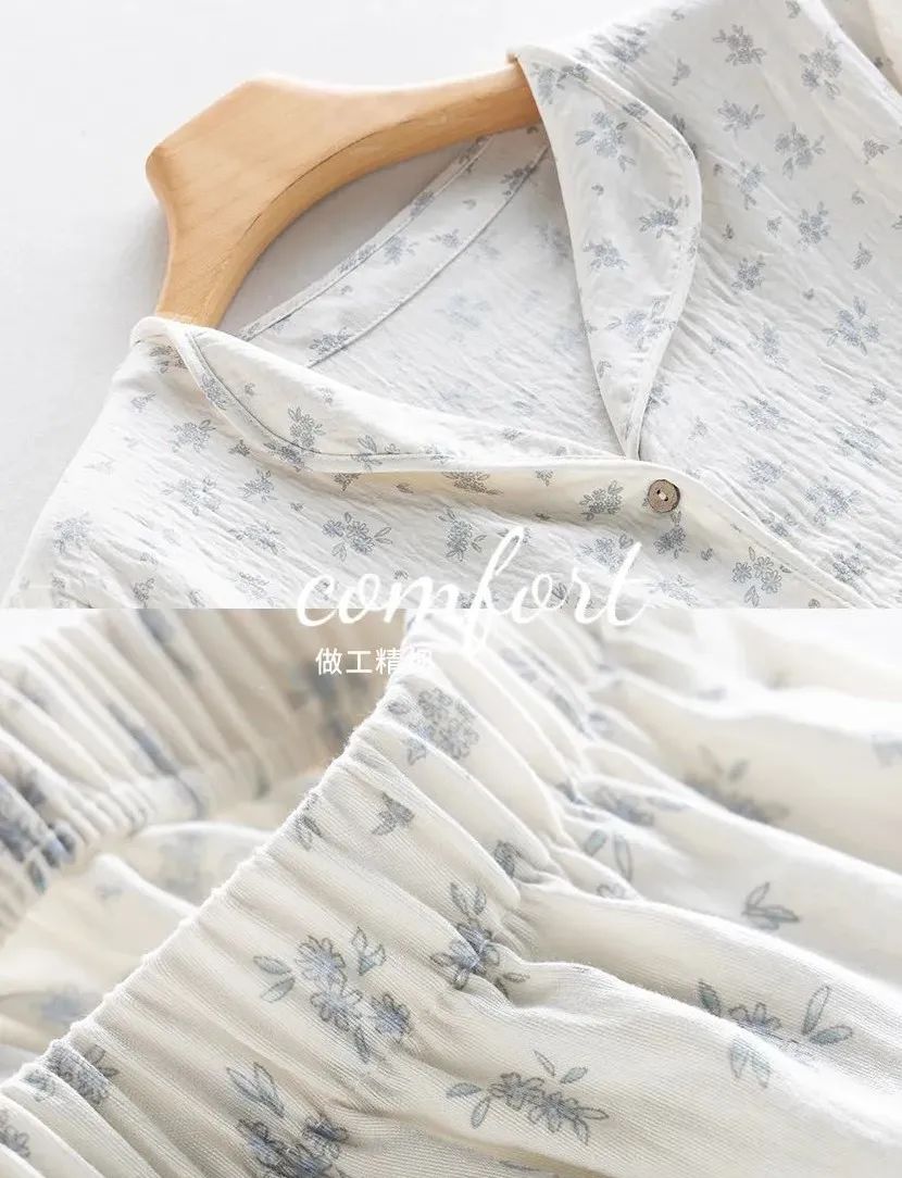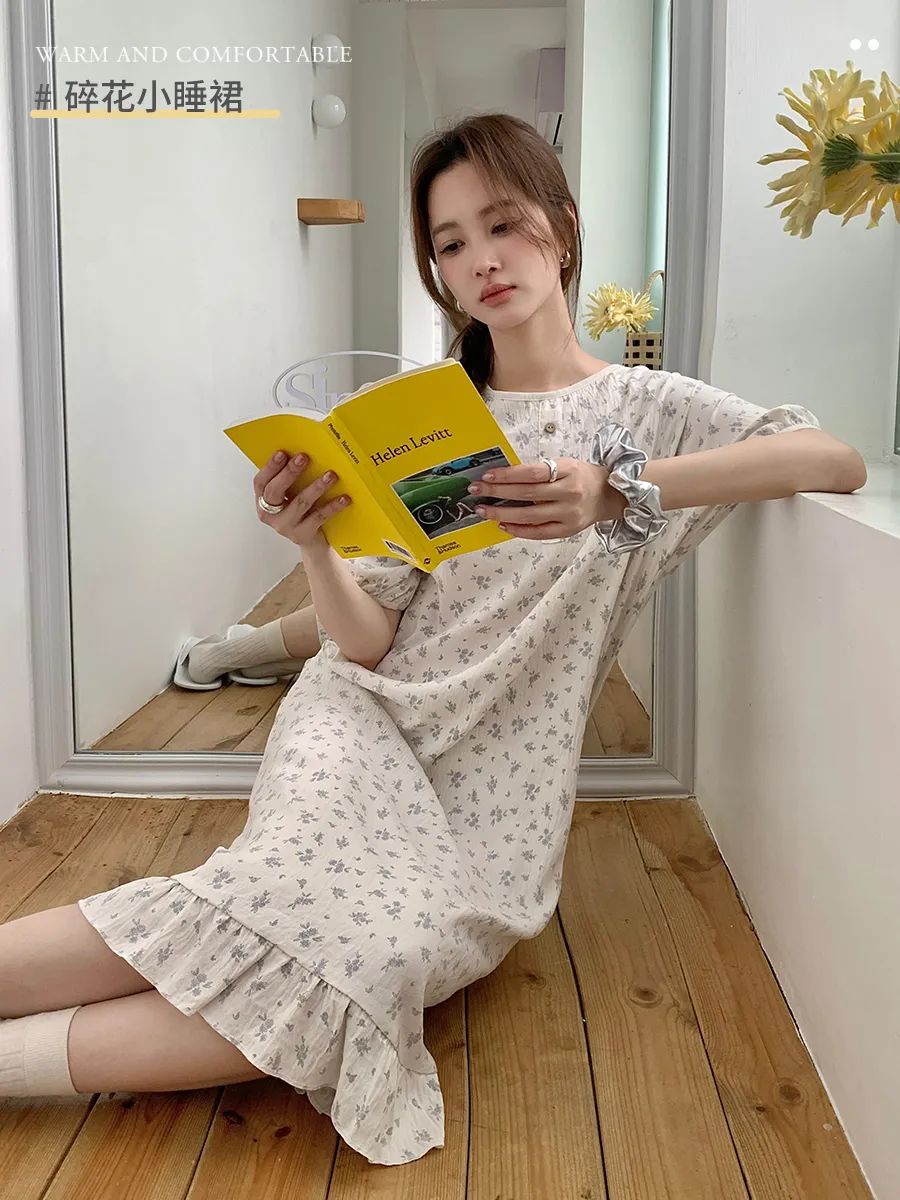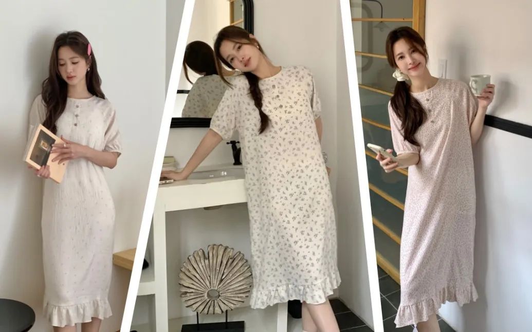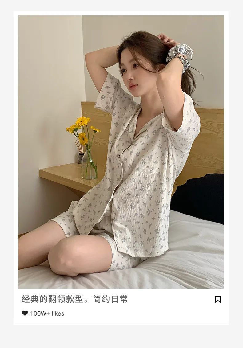 不用担心大腿和臀部的地方,因为长时间坐着而出现尴尬的褶皱。高腰的松紧设计,可以很好的藏住腹部的赘肉,无形中提高腰线拉长腿部线条,视觉上会更显腿长更显高。裤管的长度也足足的,直接盖到脚踝,顶着大太阳出门,也不用涂防晒霜啦,省钱又省力,还能避蚊,好处太多惹!碎花睡裙是一种轻盈、浪漫且充满女性魅力的睡衣款式。这款睡裙有着清新的碎花图案和舒适的穿着体验,超级减龄,温柔可爱,轻薄透气!拿到手就会爱上了。面料亲肤柔软,穿上就不想脱下来。上面领口开的不大,中规中矩,短袖设计,不用担心自己的内衣带子是不是漏出来了。清新治愈的小碎花,把夏天的浪漫揉进了生活这些花朵图案小巧玲珑,为睡裙增添了一份优雅与浪漫。几个颜色的碎花都是简单活泼的,看着很清爽,夏天穿再合适不过,浅色系的衣服也不用担心掉色问题,根本没色可掉,放心了。裙摆宽松,随着步伐的摆动,仿佛翩翩起舞,给人一种轻盈飘逸的感觉。穿上它,仿佛就能感受到夏天的气息,让人心情愉悦,充满活力。无论是慵懒的午后,还是宁静的夜晚,结束忙碌的工作后,换上心爱的家居服,能为你带来一份温馨与浪漫。它不仅仅是一件睡裙,更是一份对生活的热爱与向往。穿上它,让自己沉浸在这份美好中,享受那份独特的甜蜜与幸福吧!不得不说,穿好看的睡衣真的能让自己心情愉悦,宅家幸福感也蹭蹭往上涨呢!正好也升温了,今年夏天这款——“夏日宅家套装”短款家居服版型是开衫纽扣型的,上身有种自然垂坠感,可以巧妙自然的遮住腰腹部肉肉,完全不会有卡肉的尴尬。裤子则是松紧腰的那种阔腿中裤,没有一点丢丢束缚感,完全放飞自我,一觉睡到自然醒,而且也不会穿腻,毕竟基础款才是yyds!这款也是小编最最最喜欢的家居服了~(已经买来穿了一星期了哈哈)这款夏季肌理感家居服,让你外出拿外卖扔垃圾也不会尴尬,成全你的慵懒,又能保持你的精致美丽。贴在肌肤上比裸睡还舒服,加上它独有的肌理纹路感,穿上给整个人的气质都加分不少。柔软丝滑像夏日的棉花糖一样,少女感爆棚,马卡龙在它面前都黯然失色。上身非常轻盈,加上它独有的肌理纹路感“小设计”,整个人气质都高级不少。这种肌理感面料使它的抗皱力也很强 ;诺!怎么揉搓都不会皱!哪怕你一直穿着它在床上打滚,也不用担心皱皱巴巴、失了质感。总共4种颜色不重样~ 快和你的姐妹一人来一套,住宿凑一块穿,敲有爱哒~