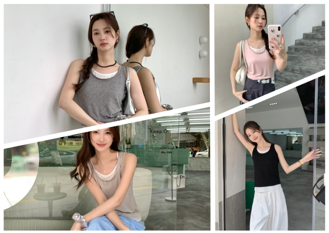 超级好穿的春夏内搭打底背心来啦——假两件小蛮腰内搭背心这个季节正合适,内搭超级合适,外穿个小外套,特别显身材哦,夏天可以外穿也是超级好看且耐看的款式。采用兰精天丝莫代尔纤维,这种纤维通常被用在婴幼童春夏季贴身衣物中,手感细腻丝滑,面料舒服,吸汗透气。这件背心的面料肤感超级舒服,软软糯糯,还有一丝凉感,接触皮肤的一瞬间,就觉得很丝滑轻柔。手感垂顺,面料柔软关键是,谁穿谁好看,还不挑肤色 假两件设计,相当的耐看好看。上身真的怎么看怎么好看的,适合任意年龄段任意场合,春天内搭显身材,夏天直接外穿超级性感!颜色上,背心提供四种颜色选择,四种色调搭配起来极富层次感,视觉上的冲击力很惊人。叠穿假两件背心采用了叠穿与撞色的设计,这使得整件衣服充满了层次感,让你在炎炎夏日里也能成为视觉焦点。而韩系潮流的假两件设计,更是让你在一件衣服中就能演绎出不同的风格,无论是配合热裤,还是其它款式,都能巧妙展现你的时尚态度。此外,宽肩带设计让你在穿着的同时减少肩部的压力。细节上,四针六线的高品质缝合,做工走线超级工整,让每个细节都恰到好处,展现了优质的品质感。高质量的面料,独特的设计,仔细的细节处理,都使得这款背心成为你衣橱中不可或缺的一部分。让我们一起在这个夏天,尽享时尚与舒适的双重享受吧!» 05