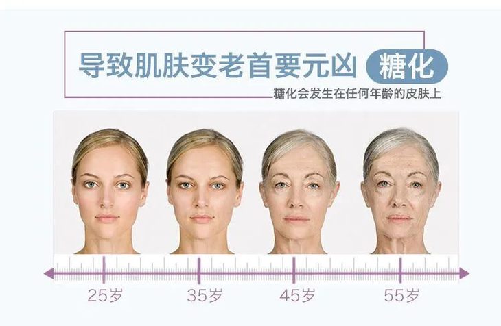 两种蛋白如果被糖化反应,就会造成肌肤弹性张力下降,原本吹弹可破的肌肤,就会像泄了气的皮球,瘪气皱巴巴的。