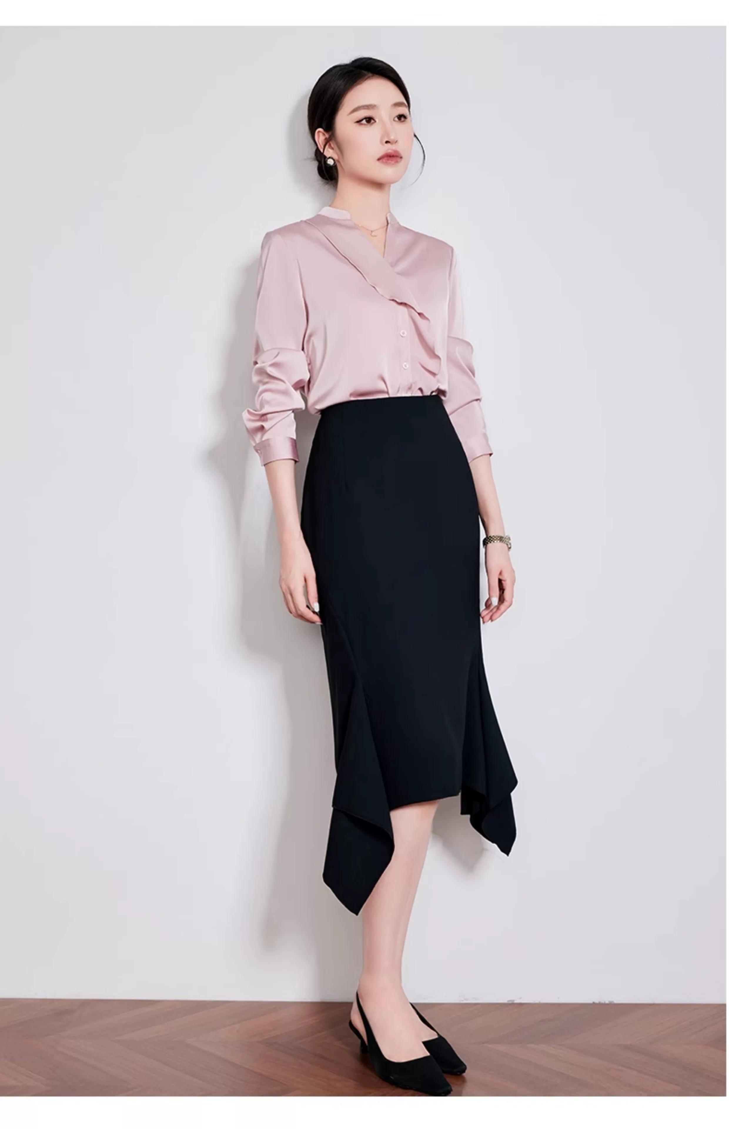 半开 V 领 + 立领小翻领的组合,既保留了衬衫的正式感,又能修饰颈部线条,拉长视觉比例;侧边层叠荷叶边沿门襟自然垂落,在干练中注入浪漫气息