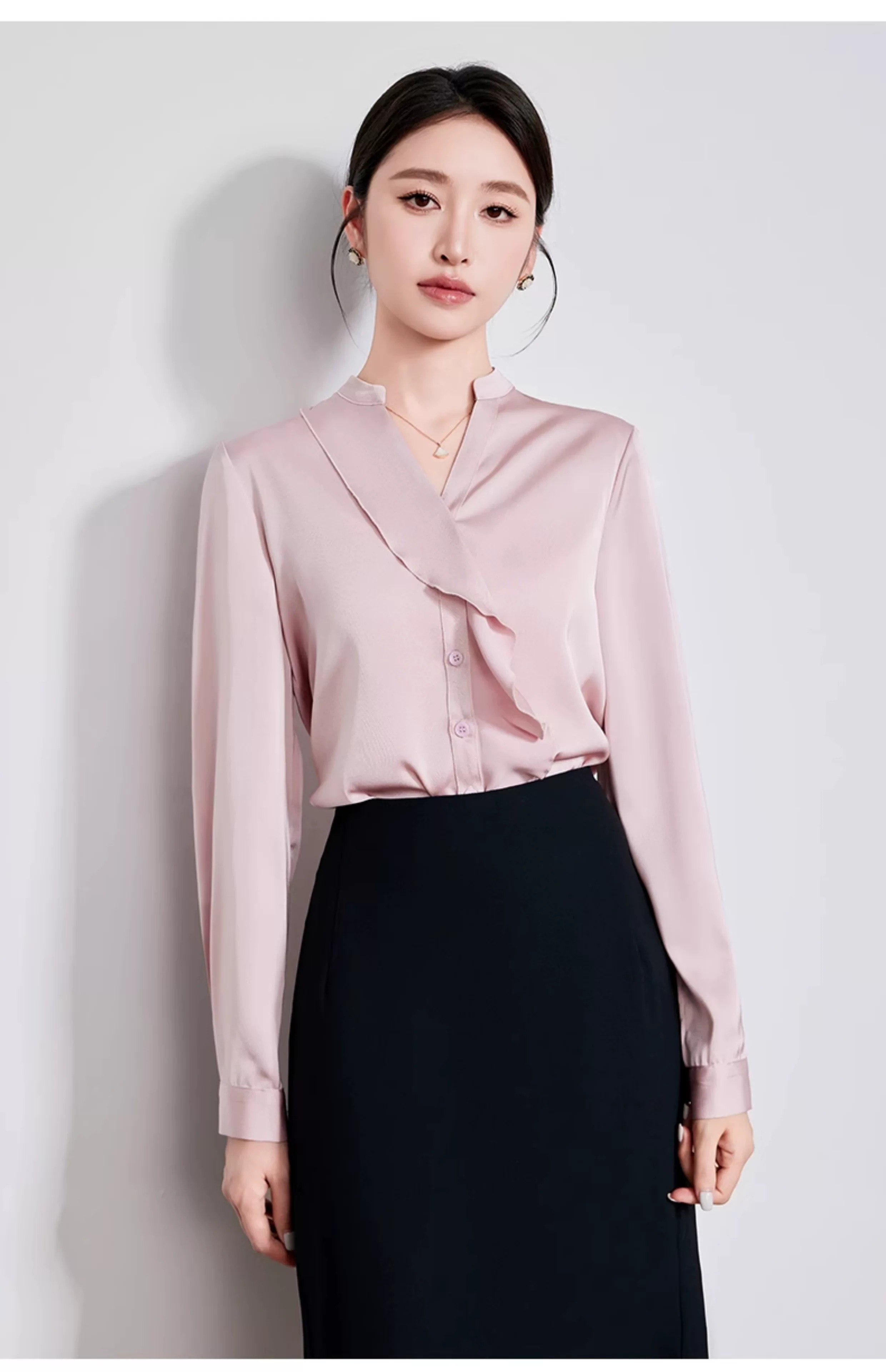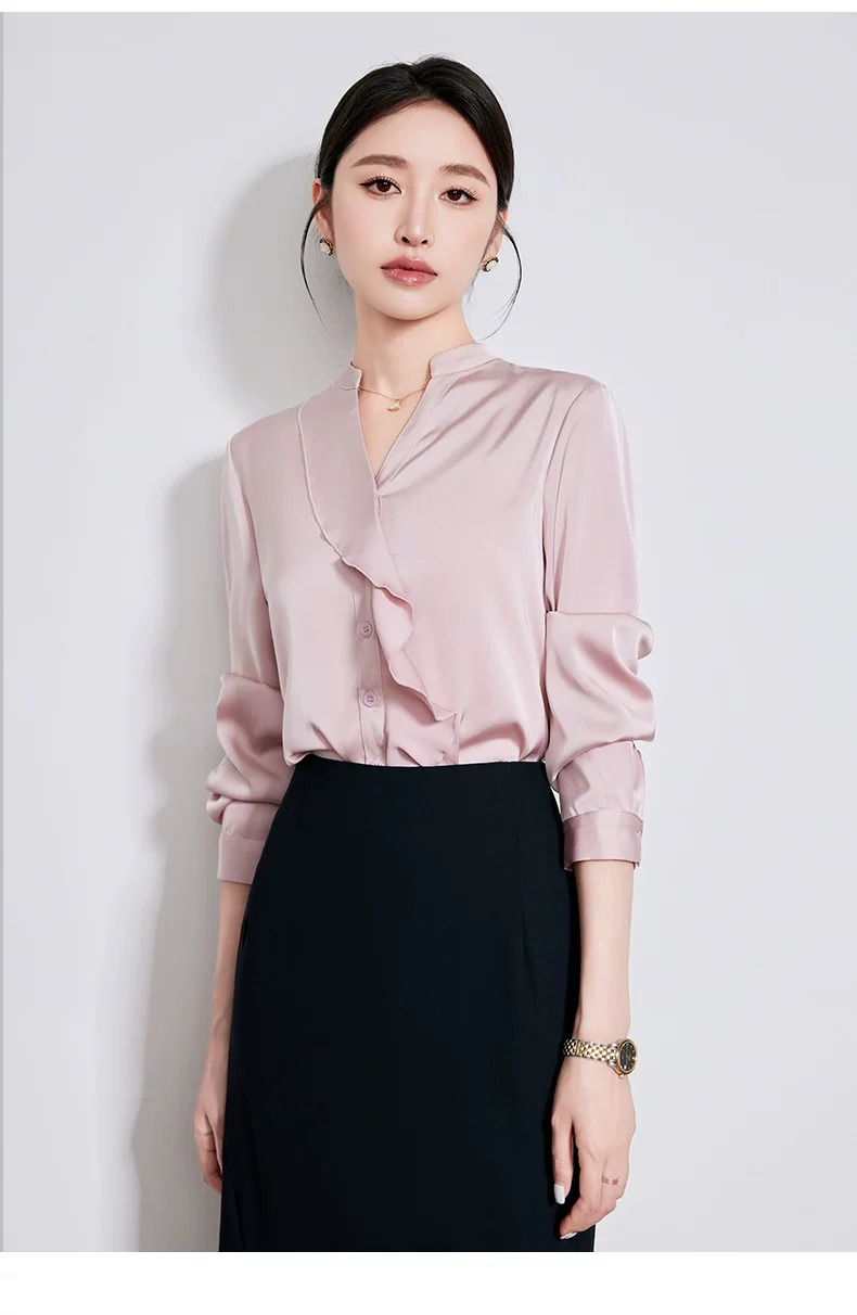 温柔粉调遇见缎面光泽,这件V 领荷叶边长袖衬衫,便重新定义了通勤风的优雅边界