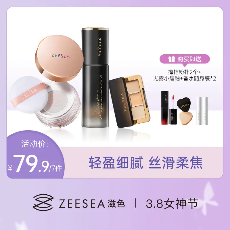 整个组合有:柔光无瑕粉底液+柔光无瑕三色遮瑕膏+丝柔定妆蜜粉+拇指粉扑2个装+小唇釉M20+香水随身装*2,一共7大件!