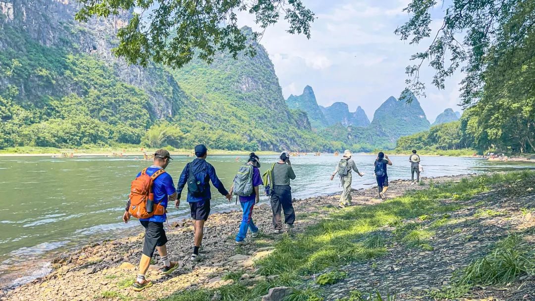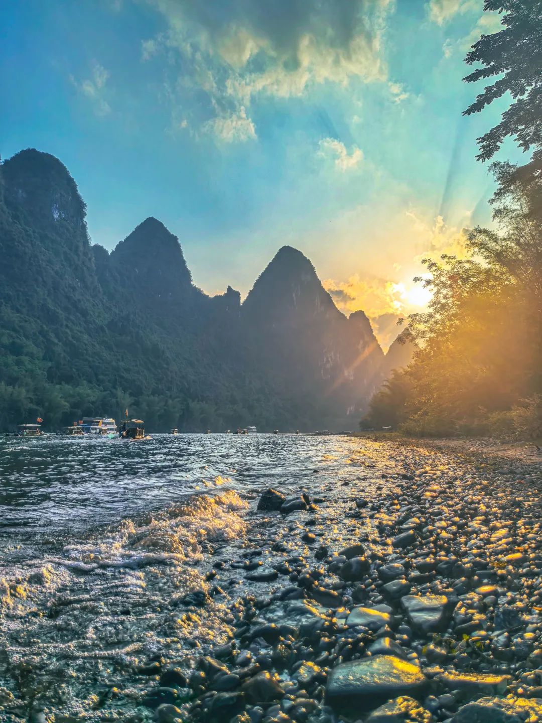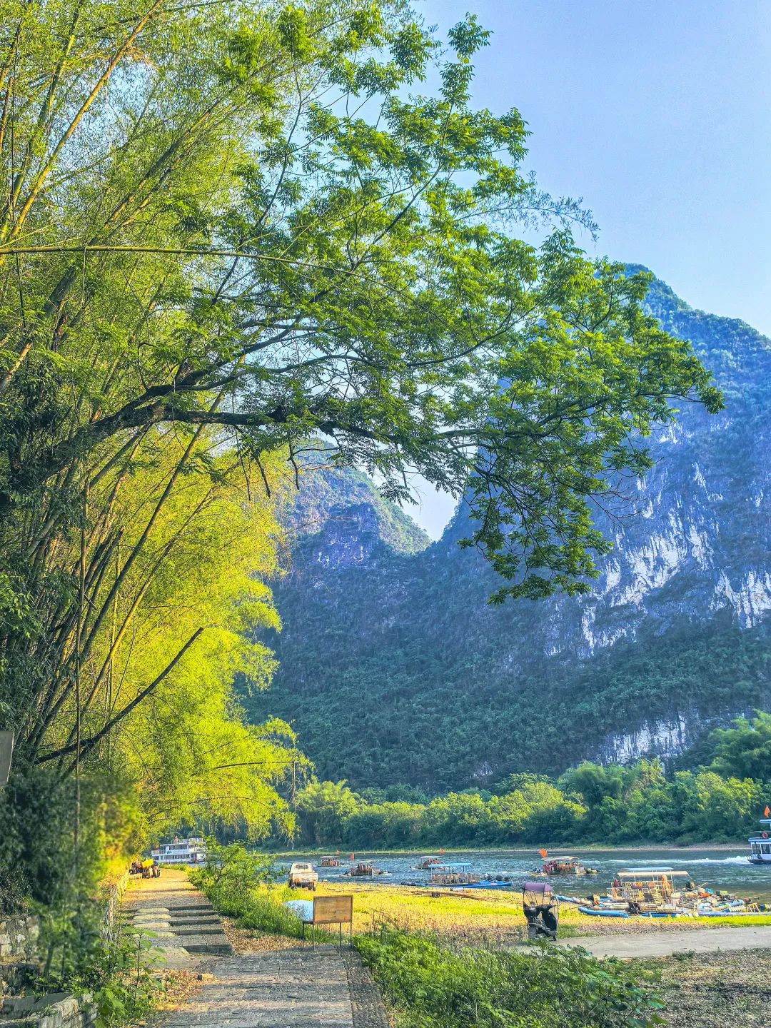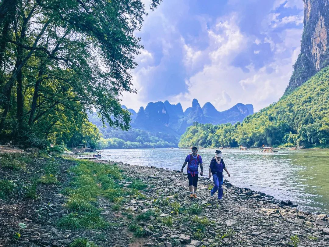 到达冷水渡口后,我们沿着漓江步道前行,漓江的水清澈见底,两岸青山连绵,倒映在水中,宛如一幅水墨画卷。我们漫步在江边,感受着江水的灵动与青山的静谧,将这如诗如画的美景尽收眼底。