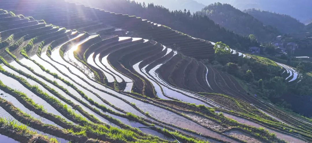 金灿灿的阳光倾泻而下,将层层叠叠的梯田镀上耀眼光芒,风掠过嫩绿的秧苗,翻涌的稻浪宛如大地跃动的脉搏,在眼前铺展成一幅鲜活的田园画卷。
