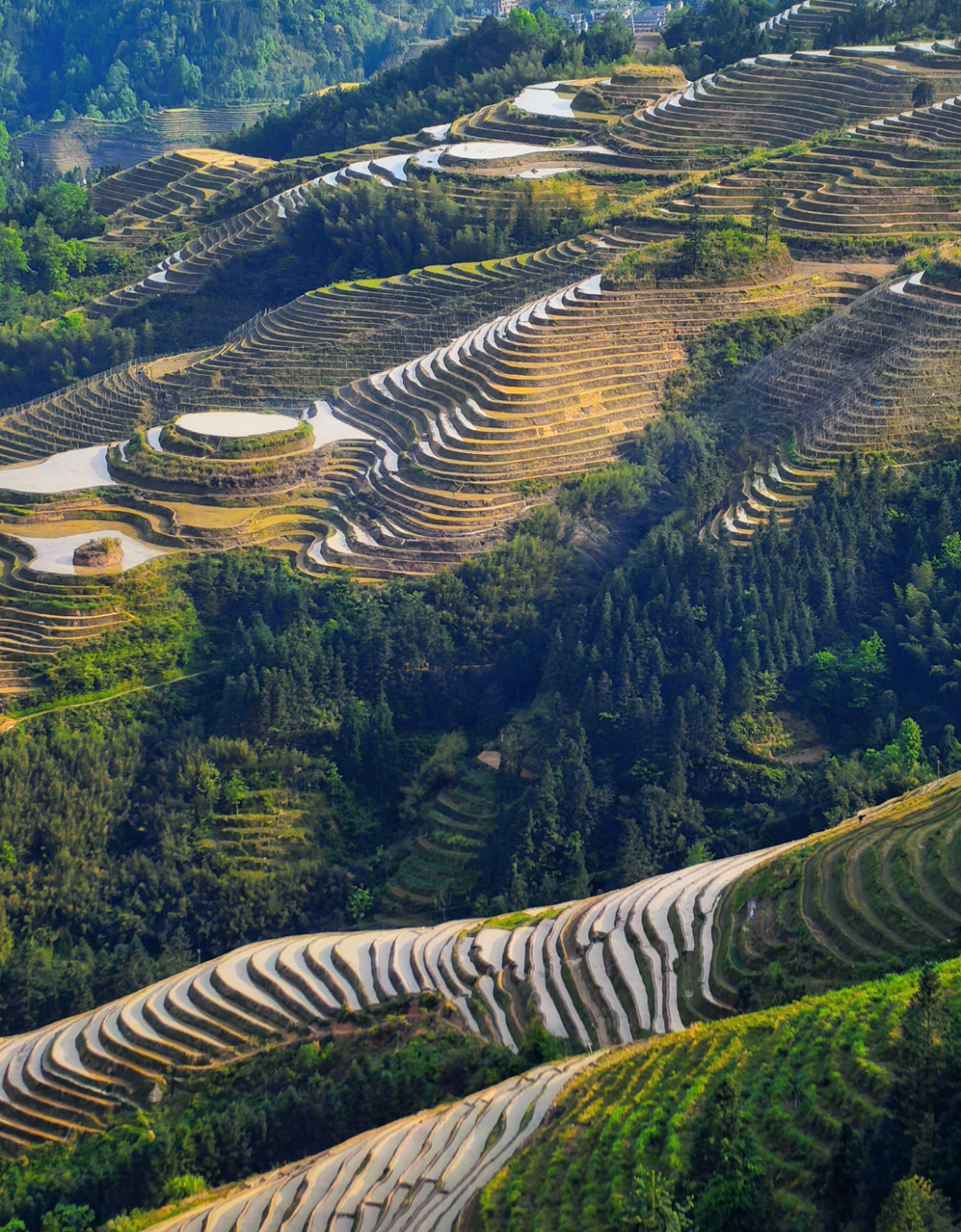 夕阳开始西斜,天边渐渐染上绚丽的橙红色,余晖洒在梯田上,波光粼粼,宛如无数碎金。山风掠过耳畔,带着一丝凉意,所有的疲惫都在壮阔美景前烟消云散,取而代之的是满心震撼与成就感。