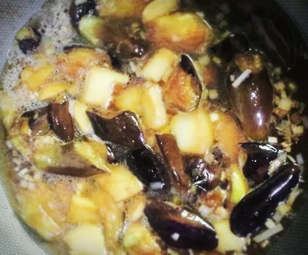 1、热锅凉油,油热后将肉入锅,放入葱花,蒜末煸香,煸香后土豆茄子入锅翻炒;