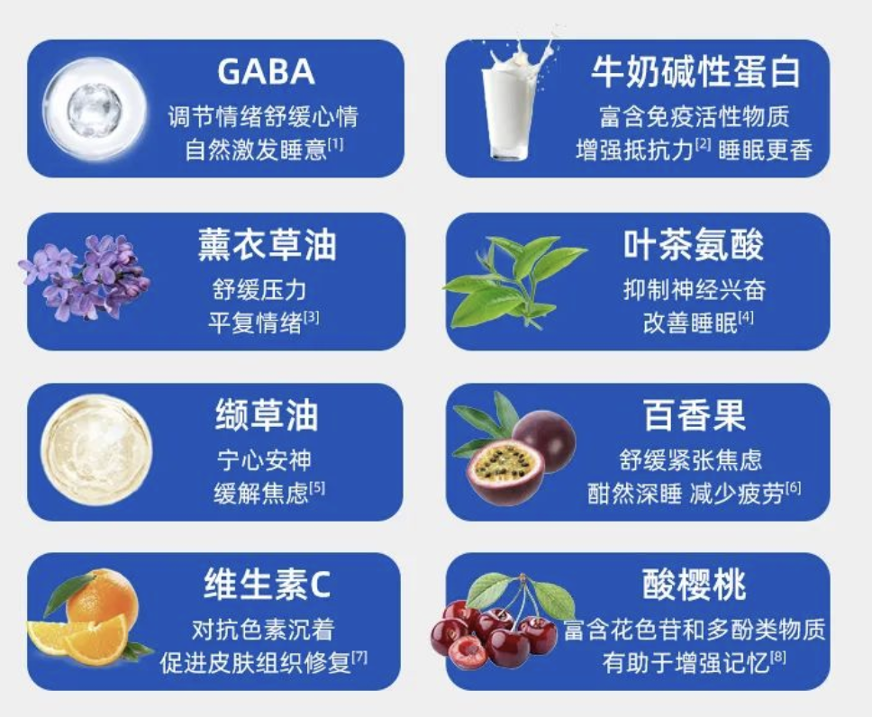 叶茶氨酸+缬草油+百香果,能抑制神经兴奋,缓解紧张情绪;