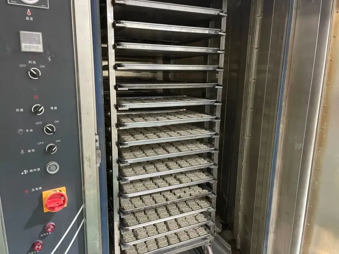压制完成后,将糕点放入烤箱中慢火烘熟成型即可。