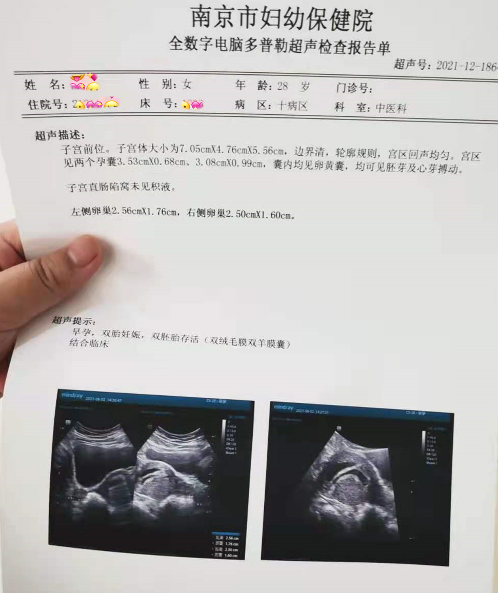 进移植周期后,又是各种抽血检查B超!经过12天时间开始定了移植日子,在这期间真的又激动又兴奋!移植了两枚6ba胚胎宝宝!移植完以后第五天就测出来双杠!第八天我就抽血了验孕成功,第十四天hcg就一万多了!现在一超了双胎,一家人高兴坏了!