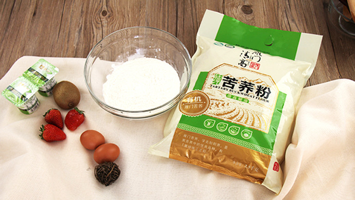 我们需要准备这些食材,小麦粉200g,苦荞粉50g,鸡蛋2颗,无糖酸奶200g,草莓5颗,猕猴桃2颗。这里注意一下要选择无糖酸奶,在水果的选择上,我们选择草莓和猕猴桃,因为这两种水果都属于低糖水果,并且又富有营养。