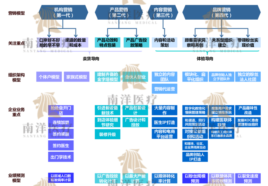 第一,机构营销。早期依赖口岸选址好、拥有黄金铺面就能赚钱,从90年代到00年代,大多占据了好的社区位置就能直接胜出。第二,产品营销时代。这个阶段依靠专科技术、新的好的神奇的产品,包括现在的慢病管理、糖尿病、无创的各样产品,产品时代在强调大家卖货的能力,无论是低价引流、国际先进设备引流,本质上都是教大家如何卖货。当前国内的物质欲望发展到了一个强烈的状态,很多人也需要产品,这是从0到1的过程,是世界所有国家都会经历的阶段。再到今天,我们在经历内容营销时代,越来越多医疗机构在做私域、运营自己的公众号和自媒体平台,虽然好像做了很多内容,但能够和用户产生长期连接的其实不多。让用户自己打开页面、关注公众号、看到这家医疗品牌的科普文章或抖音视频,吸流引流很重要,这是在留住客户。而公域转私域,意味着怎么去留住你的客群。内容时代是创造眼球经济、创造稀缺内容吸引观众的时代,从原来的稀缺性产品转化到稀缺性内容,这也是诸如淘宝、抖音等电商为什么发展这么快的原因,本质上讲就是货已经不缺了,现在靠概念,甚至靠畸形营销等内容吸引大家,比如直播表演吃面,观众看面特别好吃,当场下单。这实际上是发达国家从发展中国家过渡而来的历程。但是今天我们看到,发达国家的顶级医疗机构都在做自己的品牌营销。包括我的这套书《医疗机构品牌创建高阶训练系列教程》在内的很多观点都在讲,创建品牌的方法就是如何让顾客信任你的过程,有很多小技巧可以借鉴。几乎所有医疗机构都会注重自己的媒体曝光度,通过综合数据分析得到正反馈的数据,知道哪些粉丝会跟医疗机构建立长期的连接。Listen first每年做一个社交数据排行榜,是在考察医疗机构和粉丝的连接关系。当前国内一个比较明显的是,消费型(部分综合型)医疗机构有没有经营好自己的美团?评分3.5分还是4.5对顾客影响都大不一样。很多诊所上架之后都疏于运营打理,直到最近一打开发现是3.2分,评分意味着你会流失掉许多客户。现在每个顾客吃东西、去看病有可能去查美团看评分,重视自己品牌在公众渠道曝光的形象是非常有必要的。甚至同样两个4.5分、4.8分的机构,一个很有公益热情,一个很有技术特征,两者吸引的用户群也完全不一样。每个店都可以形成每个点的特色,方法很多,公众形象曝光策略就是门店品牌定位的策略。03|企业估值模型的进化