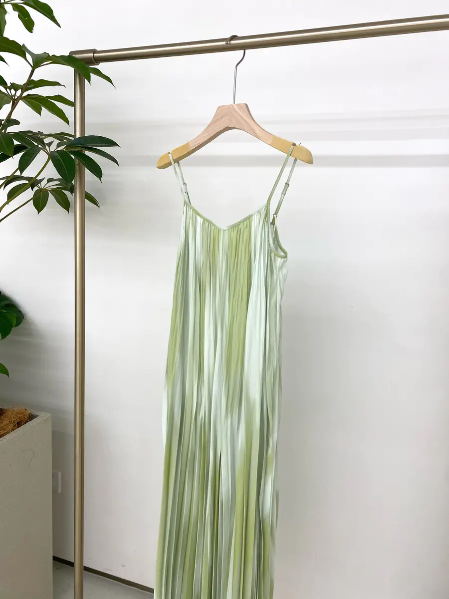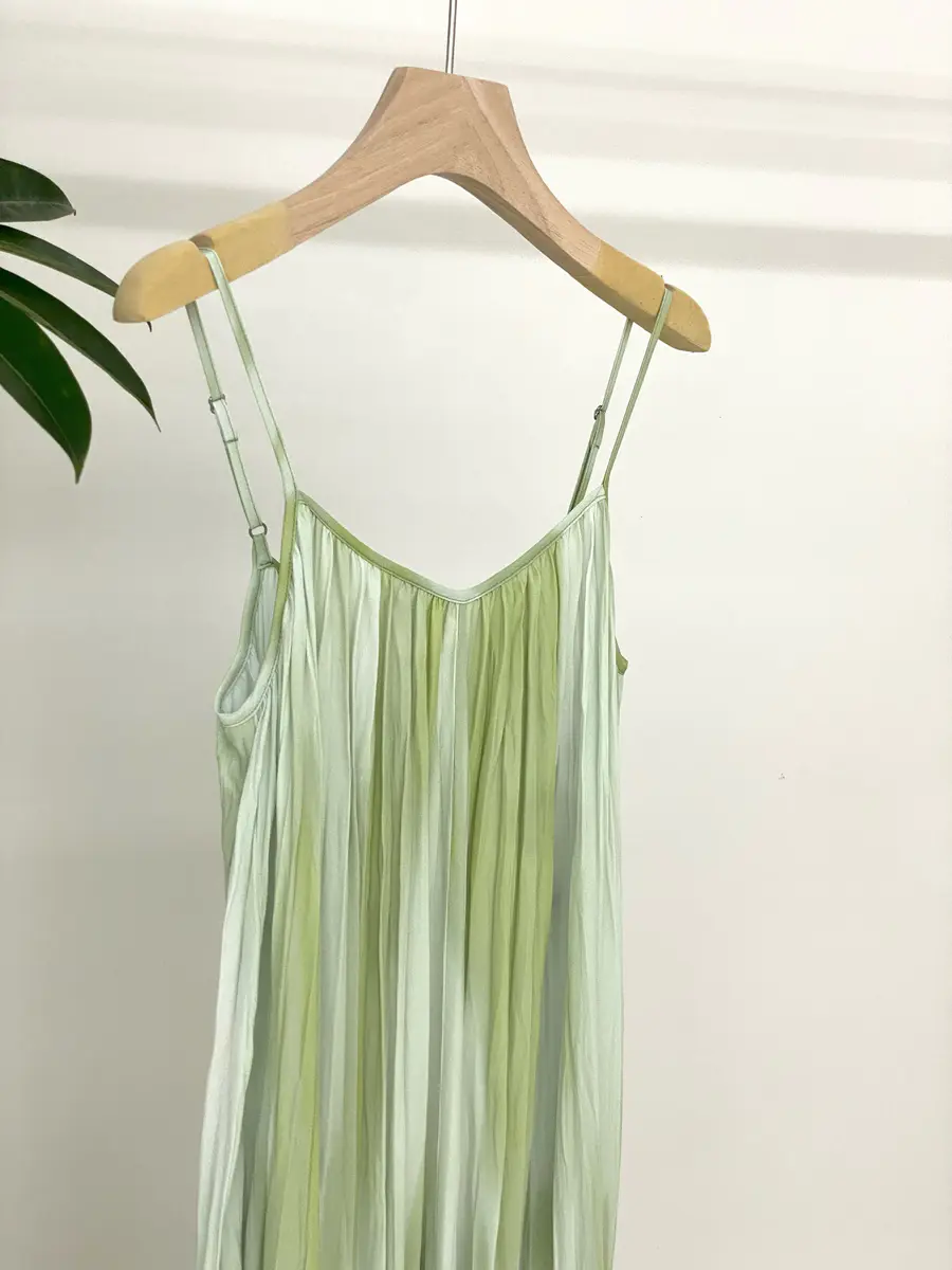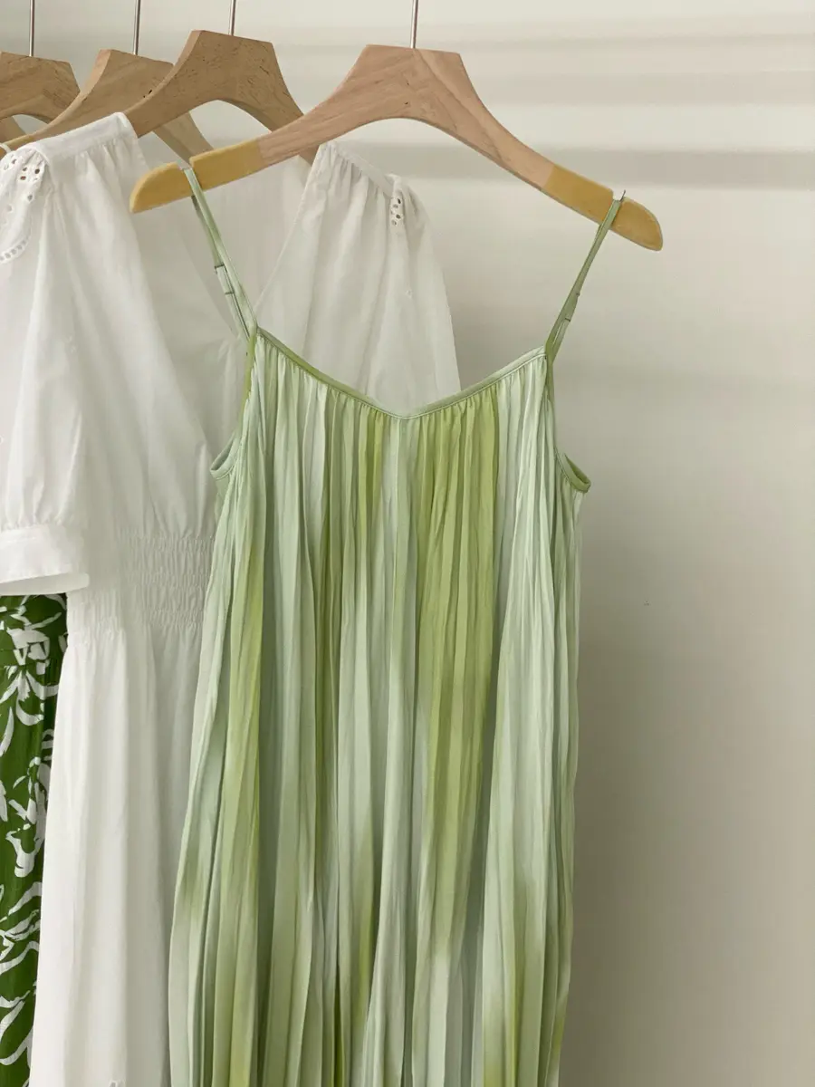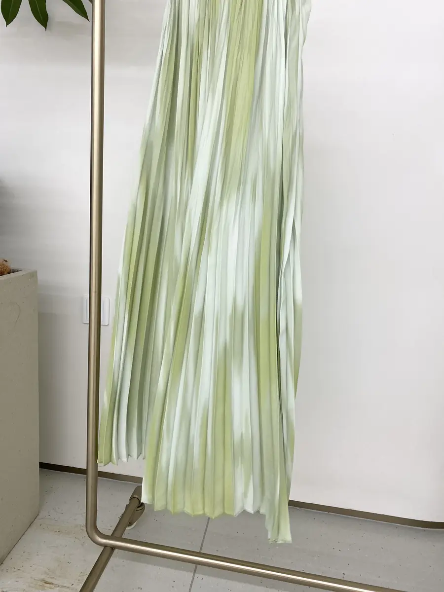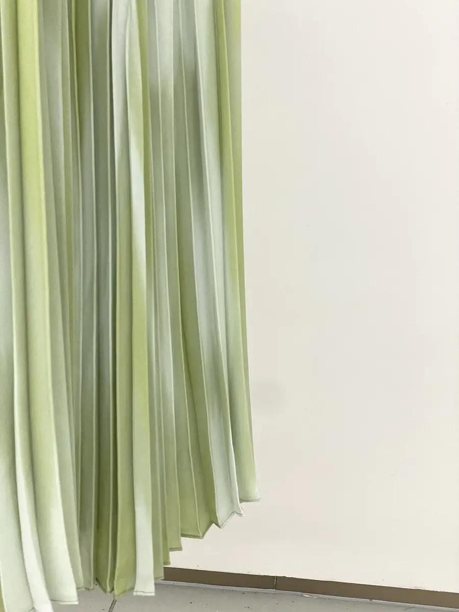 这件百褶晕染裙给人的感觉,仿佛碧波荡漾的绿色,被透气的小鱼点破水面,层层波纹在水面晕染开来,立体打褶工艺成为了整条裙子的亮点;