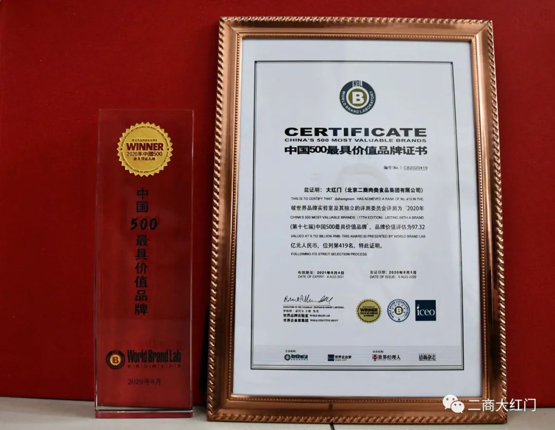 8月5日,2020年第十七届“世界品牌大会暨中国500最具价值品牌发布会”在北京举行。国际权威品牌评审机构——世界品牌实验室(World Brand Lab)发布了2020年度《中国500最具价值品牌》分析报告及排行榜。北京二商肉类食品集团有限公司旗下“大红门”品牌以97.32亿元的品牌价值荣登排行榜,位列第419位。