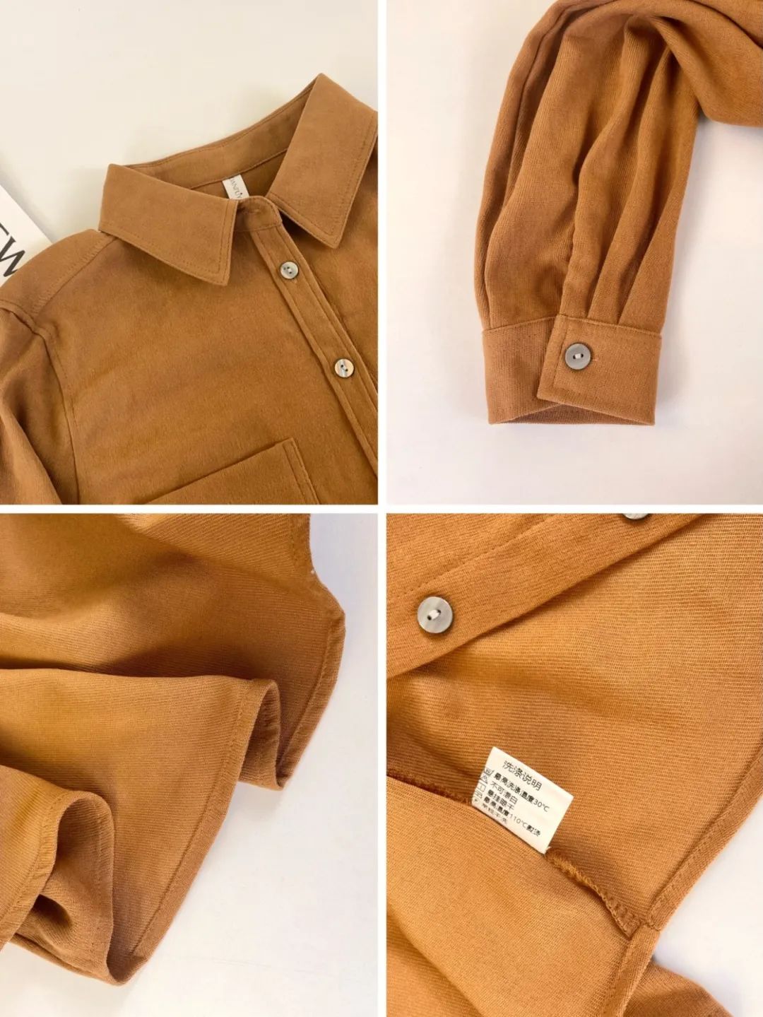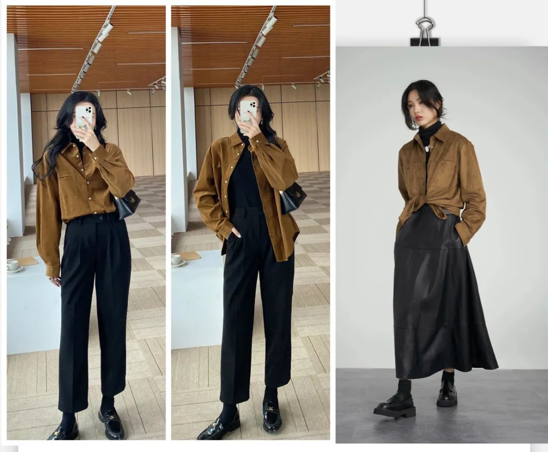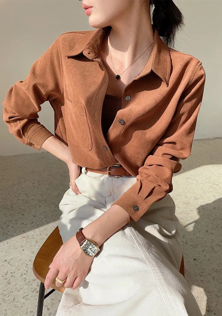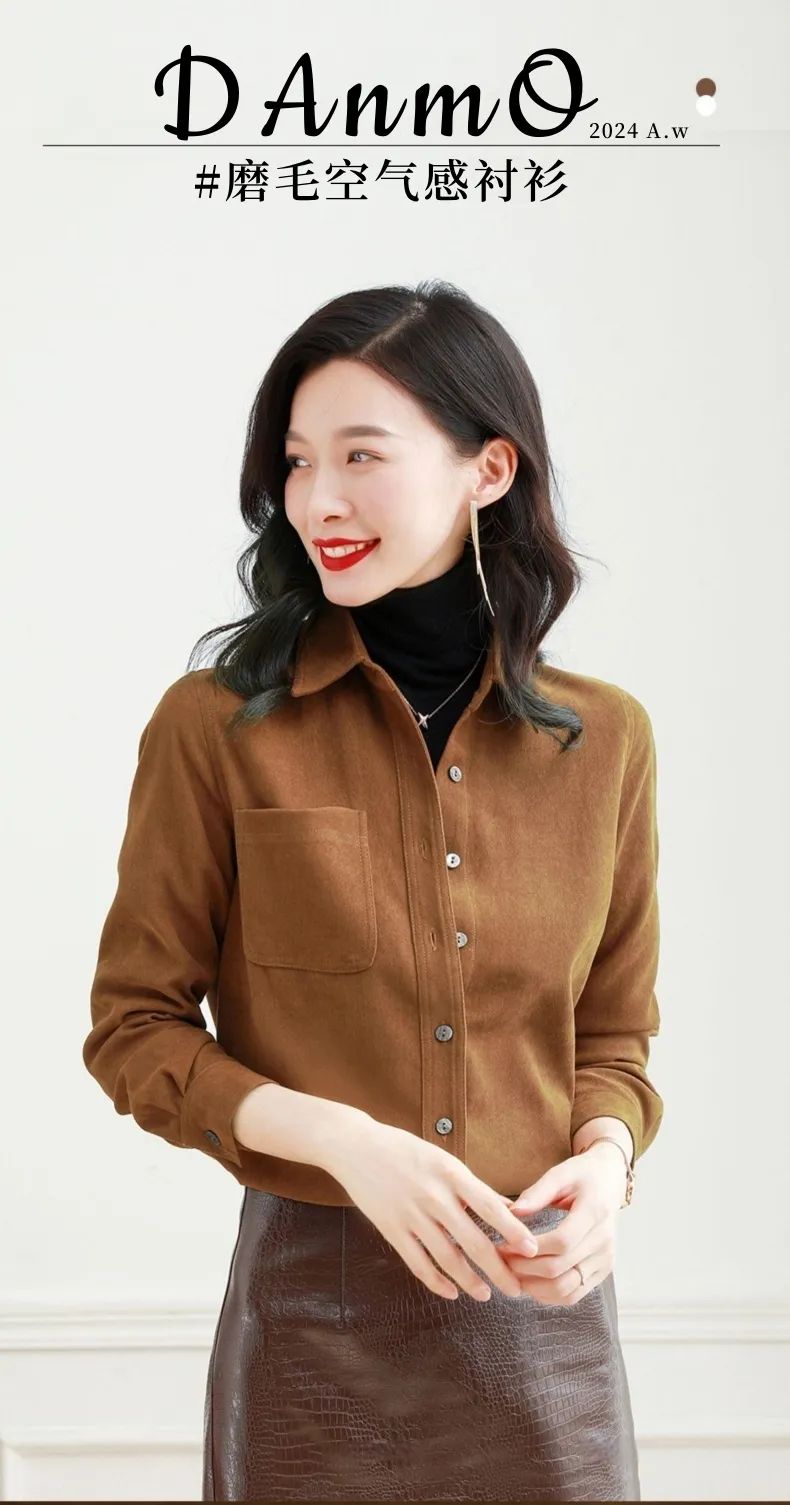 这件衬衫是很复古的磨毛款式,从外形看简约大气还有点小外套的感觉,当成打底或者穿在外面都很显瘦!
