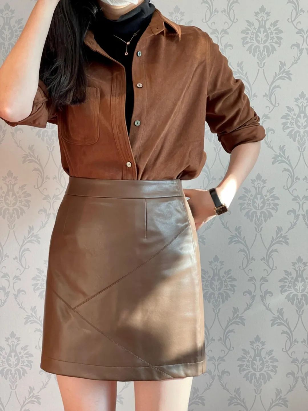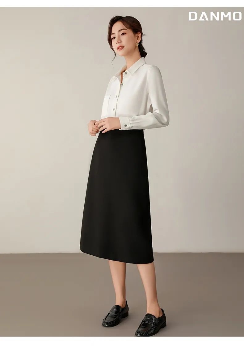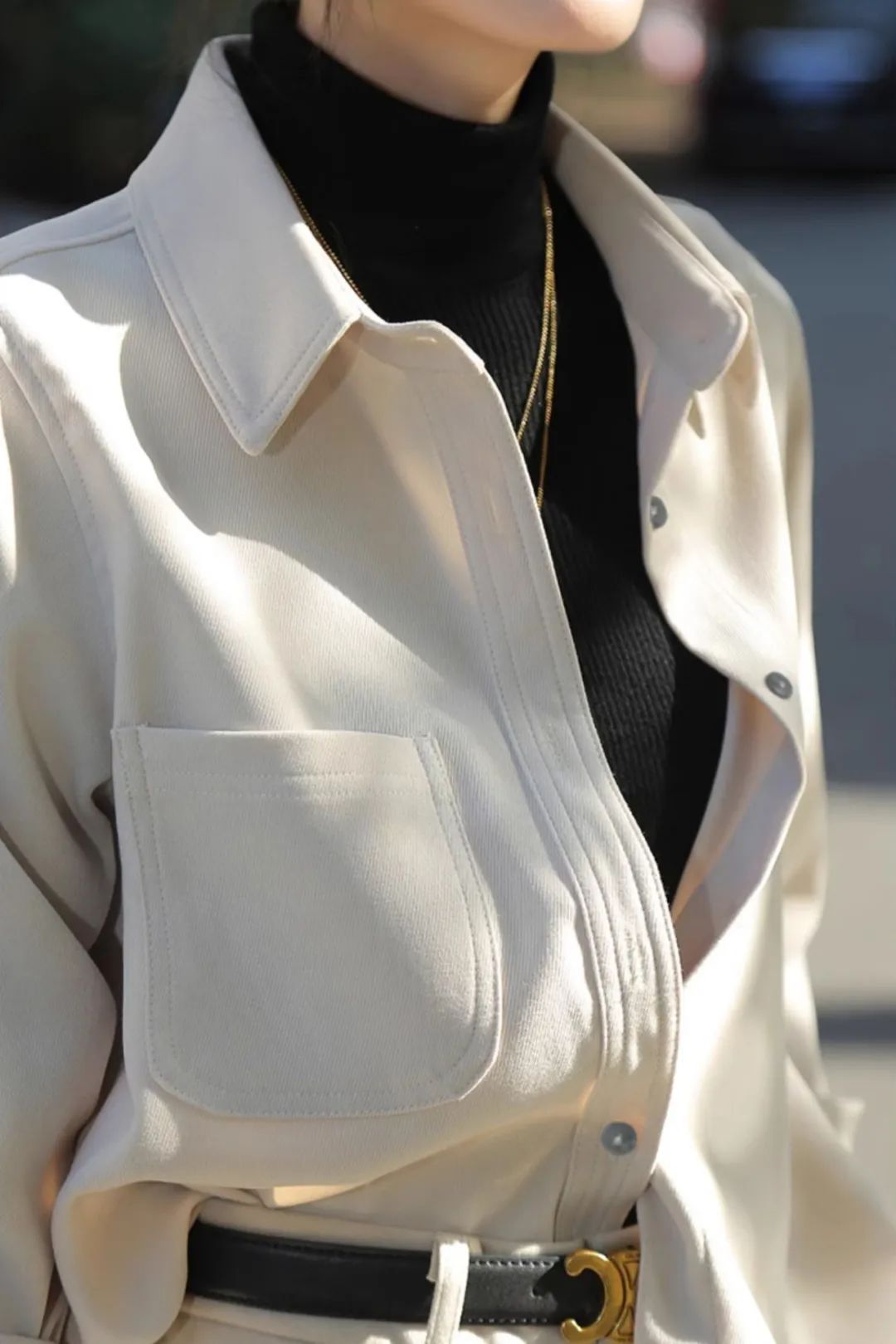 多解开2颗扣子,就可以轻松打造V领效果,不仅拉伸颈部线条、显瘦,还有一丝小性感。