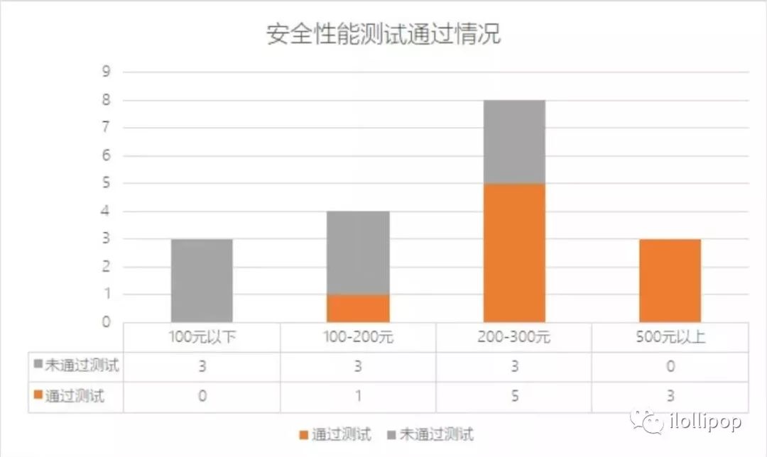 比较试验发现,100元以下的3款滑板车均未通过安全性能指标的测试;100元-200元的4款滑板车有3款未通过,未通过率为75%;200元-300元的8款滑板车有3款未通过,未通过率为37.5%;500元以上的3款滑板车全部通过,未通过率为0。由此看来,价格与安全性能有关联。
