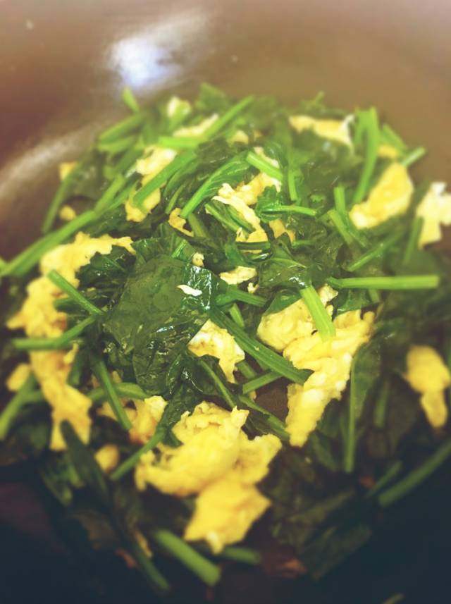 2、将鸡蛋推到一边,用底油炒菠菜,大火翻炒几下;