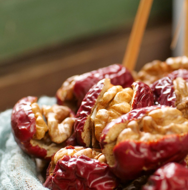 软糯去核的红枣和褪去外壳的酥脆核桃仁