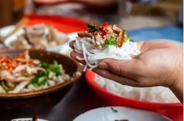 过手米线是阿昌族最中意的食品。吃时因需先取一团米线置于手心,然后将拌料放在米线上食用,由此而得名"过手米线"。