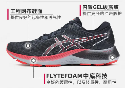 前掌内置/后掌可视GEL缓震胶,FLYTEFOAM中底、TRUSSTIC稳定片、单丝纤维材料鞋面、AHAR耐磨大底