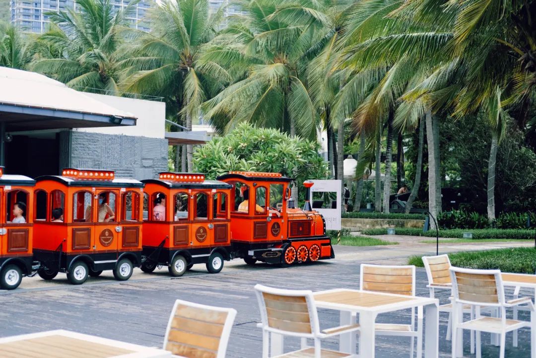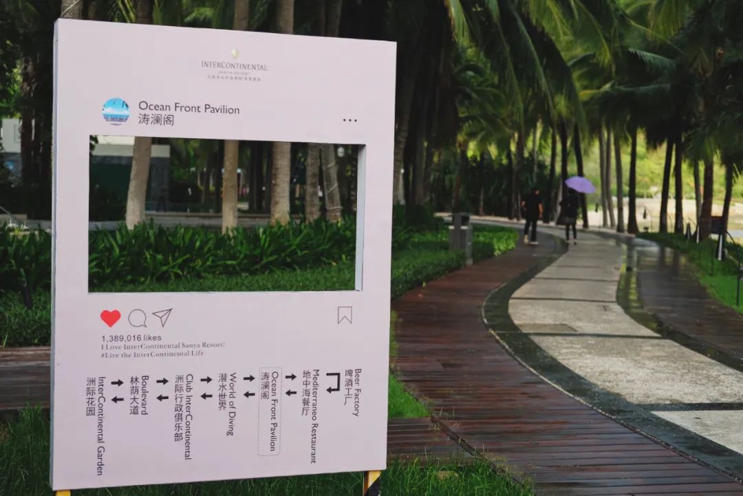 半山半岛洲际有条非常适合散步的沿海路,路上的ins指示牌将酒店内网红打卡点串联了起来,方便像酒店君这样的路痴认路,累了还能乘坐小火车绕行酒店一圈。