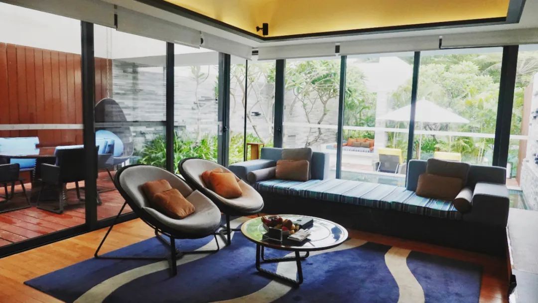客厅有两面落地玻璃窗,可直观泳池和园景,视野很赞👍