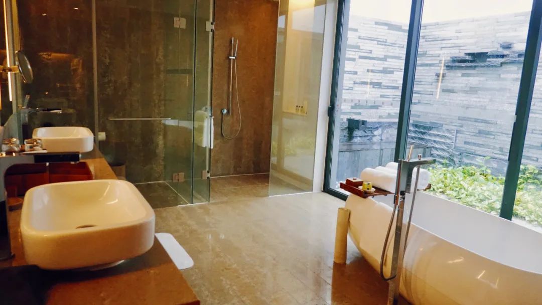 洗浴间配有两个洗手池,妹子们早上起床梳妆,不会“打架”,浴缸旁边还配有观景区!