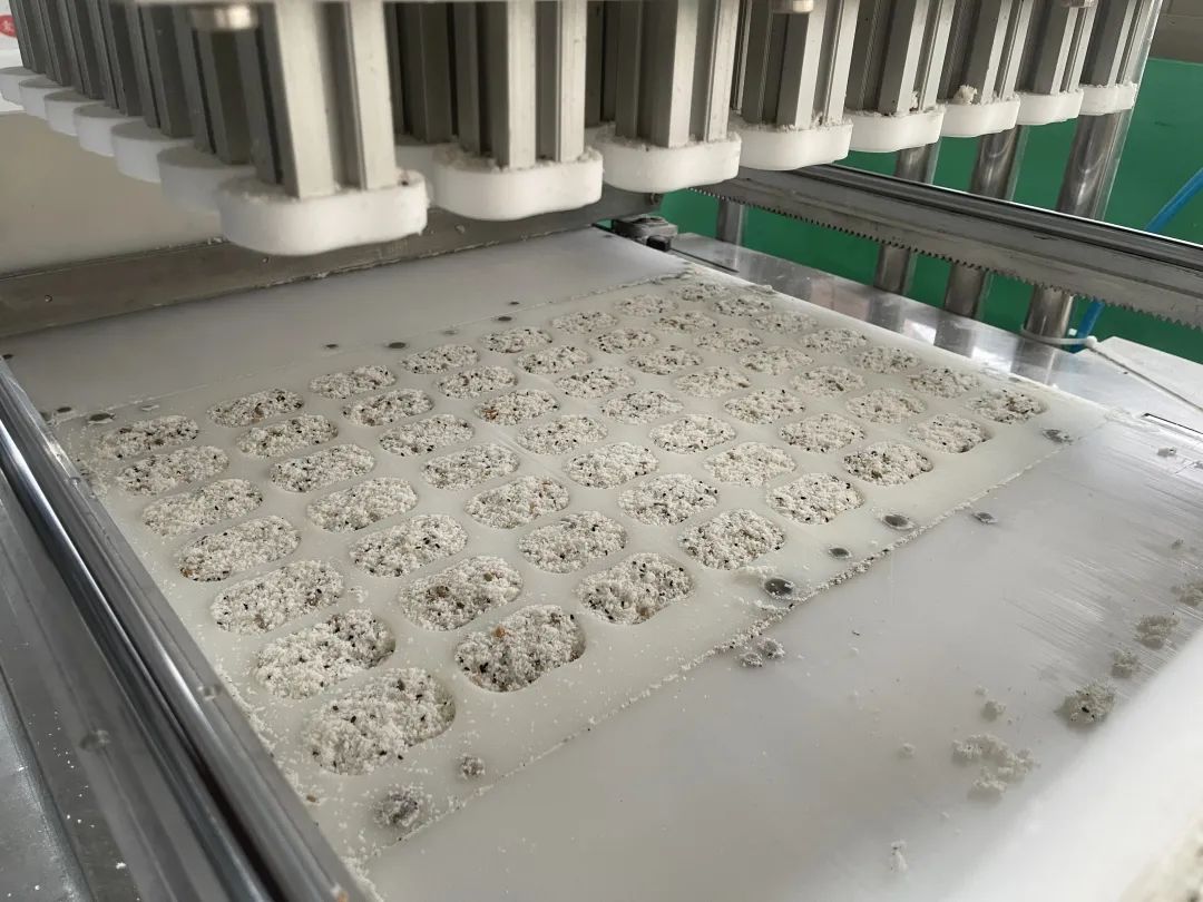 然后将料体分别灌入专门定制的模具当中,由机器完成压制步骤。