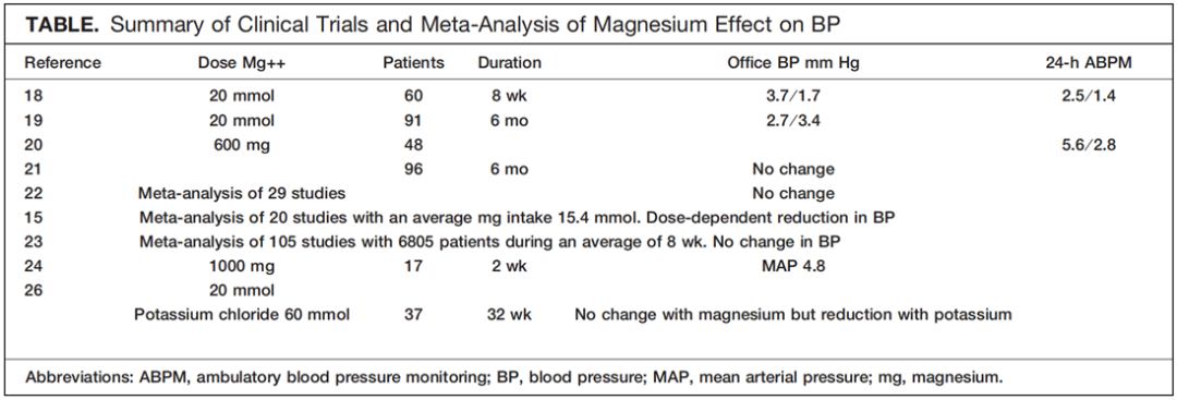 流行病学、观察性和临床试验数据显示,高镁饮食(至少500-1000mg/日)可降低血压,但效果并不一致。15-17 原因可能与所研究人群、试验持续时间、使用的伴随药物、其他营养素及矿物质、使用的镁剂类型及剂量、治疗前的镁水平、治疗前的血压水平、对依从性的监督不足、对血清镁的多种不同的检测方式、细胞内镁、或24小时尿镁排泄量,同时还缺乏对基线血浆肾素活性、必需脂肪酸状态、及镁转运状态的相关基因评估等有关。在多数流行病学研究中,饮食中镁摄入量与血压之间呈现出反比关系。15–17