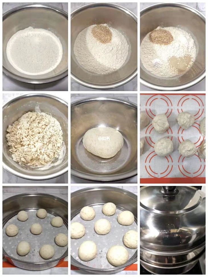 🍄所有材料混合揉成均匀光滑的面团,揪成小剂子,每个剂子再次揉光滑,制作成馒头胚,放入蒸锅中发酵2倍大后蒸15分钟,闷2分钟后开盖子即可