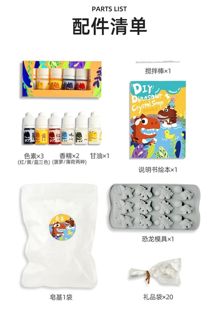 如果小孩儿特别爱恐龙,也可以选择购买恐龙主题的DIY小香皂,制做原理完全一样!