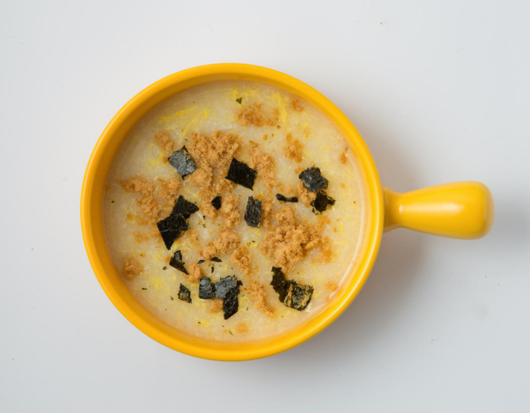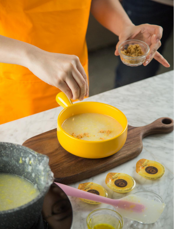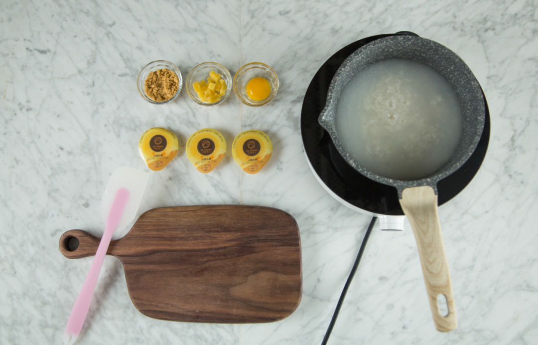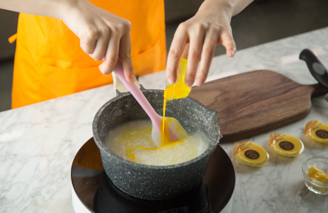 2.在煮开的米粥中加入蛋黄,打散。待蛋黄凝固后,加入奶酪丁