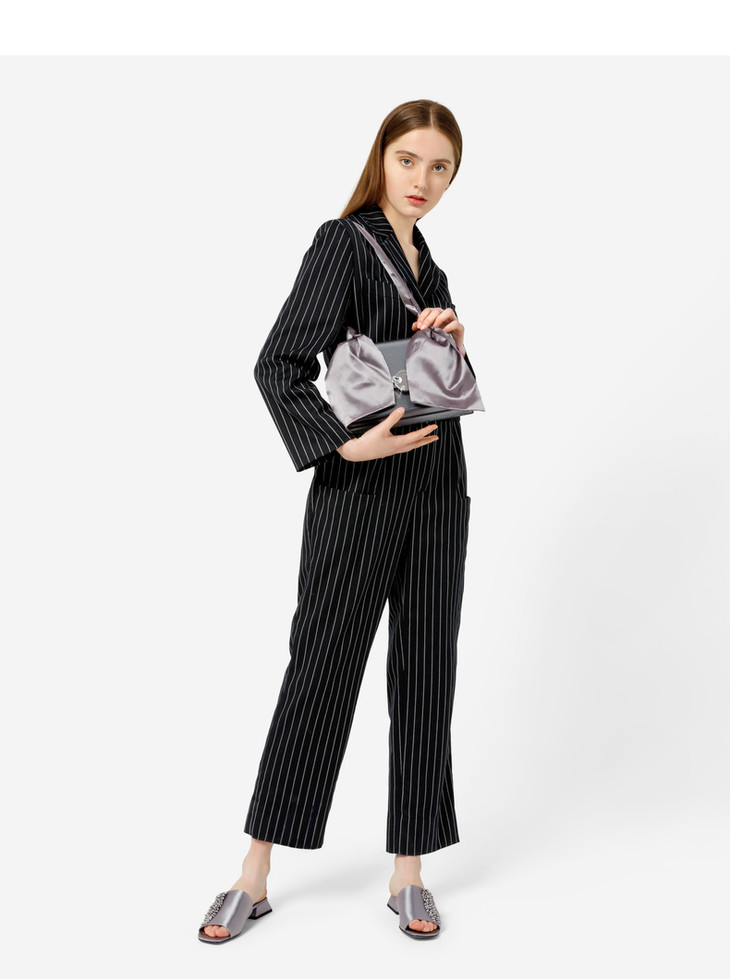 太美了,类似耳朵包的款式,绑带式沙丁布,有点高级的轻奢感,另外配有一条皮质肩带。