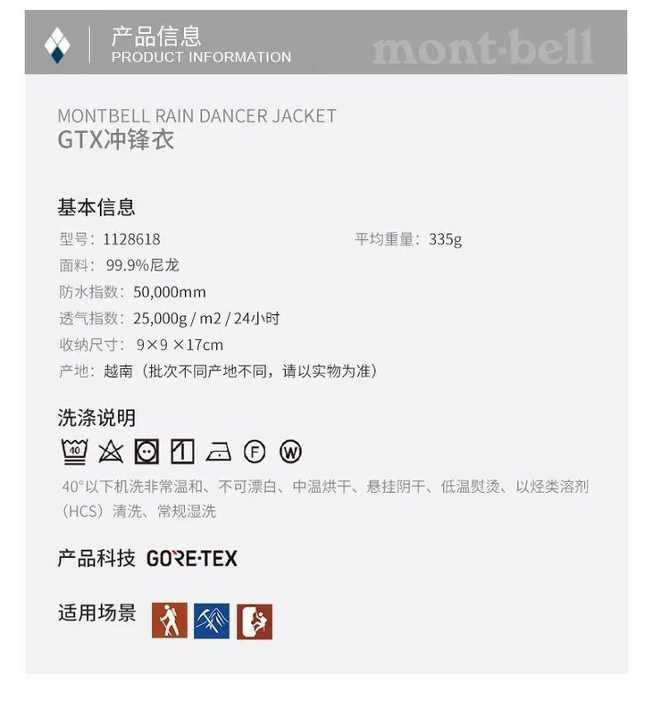 1、采用mont·bell独有的防水透气面料 三层DRYTEC®!