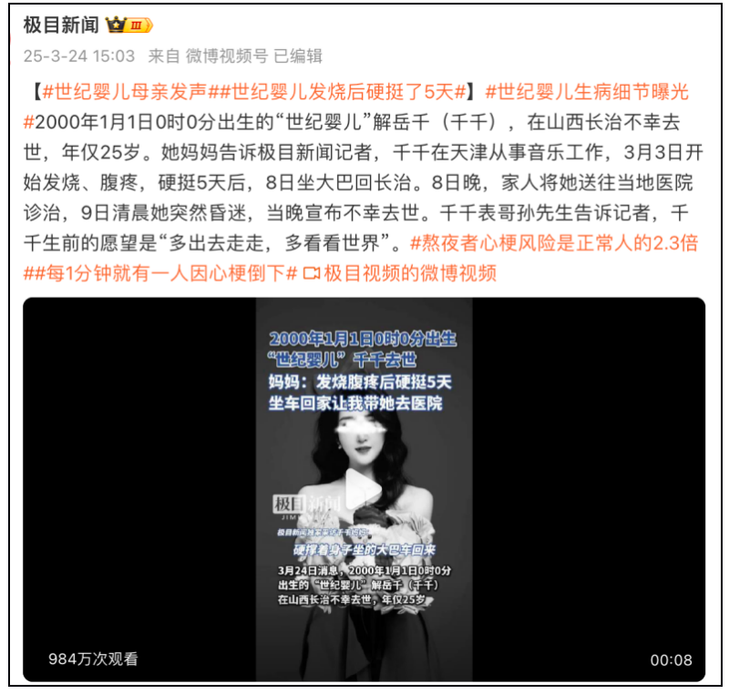 2000年1月1日0时0分出生的千千(化名)也被称为“世纪婴儿”“千禧宝宝”。3月24日,千千母亲突然发布讣告称,“世纪婴儿”千千去世,年仅25岁。