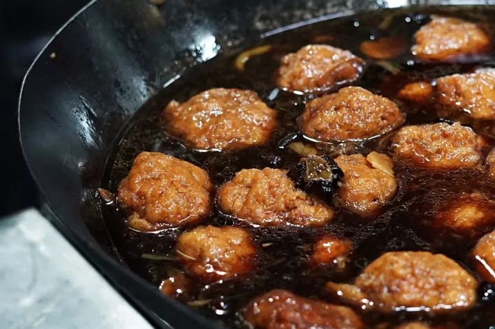 大家有没有注意到,这个狮子头不是圆滚滚的样子,而是有点像肉饼?因为旧时候油也有限,所以扁一点可以用少量油煎熟。