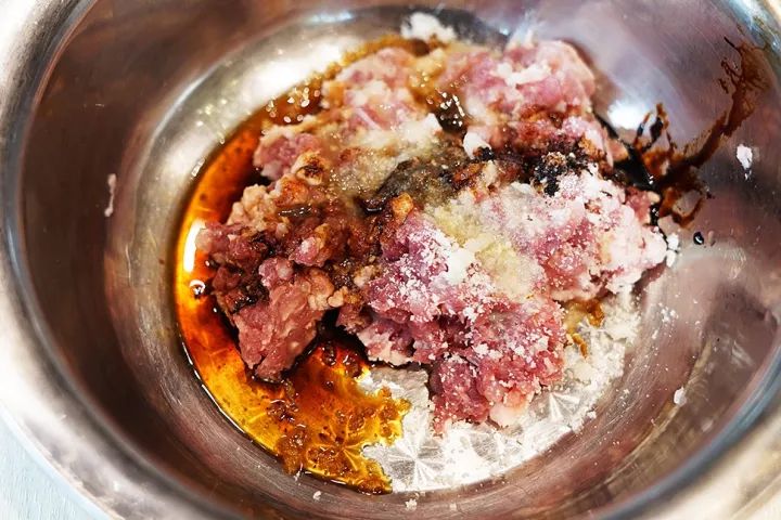 2. 肉馅调味:生姜磨成姜汁。25g姜汁、25g料酒、10g老抽、3g生抽和50g红薯淀粉放入肉馅。