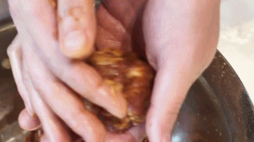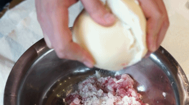 1. 剁肉馅:猪肉选择3肥7瘦的夹心肉,瘦肉和肥肉分别剁,再混合一起。馒头一分为二,按下图的手法,擦出馒头屑。1斤的肉馅,放100g的馒头渣。