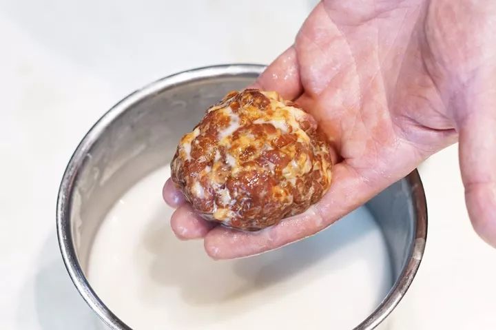 4. 裹水淀粉:调一碗水淀粉,狮子头先裹一层。