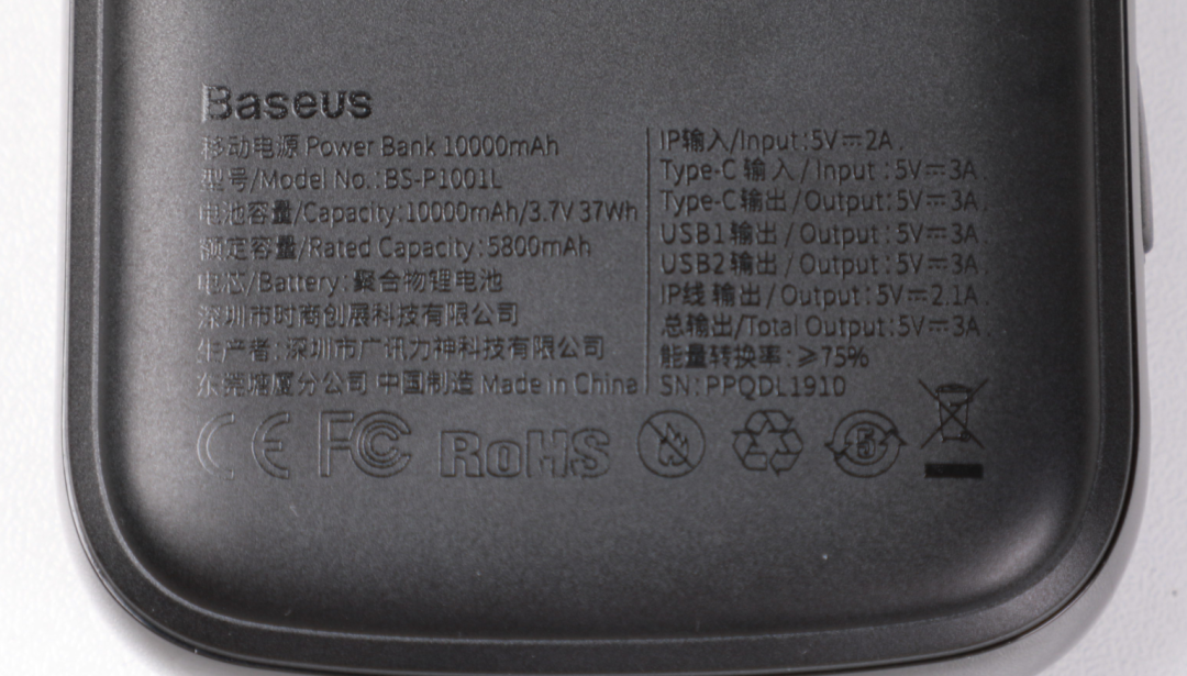 反面的底部是移动电源的参数和质量安全认证的标志。