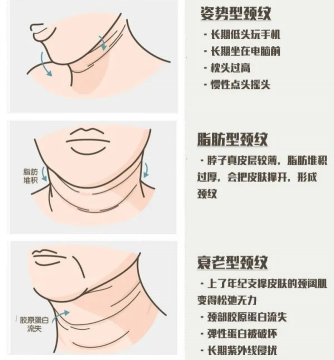 除去先天遗传因素,后天颈纹形成主要有以下原因: