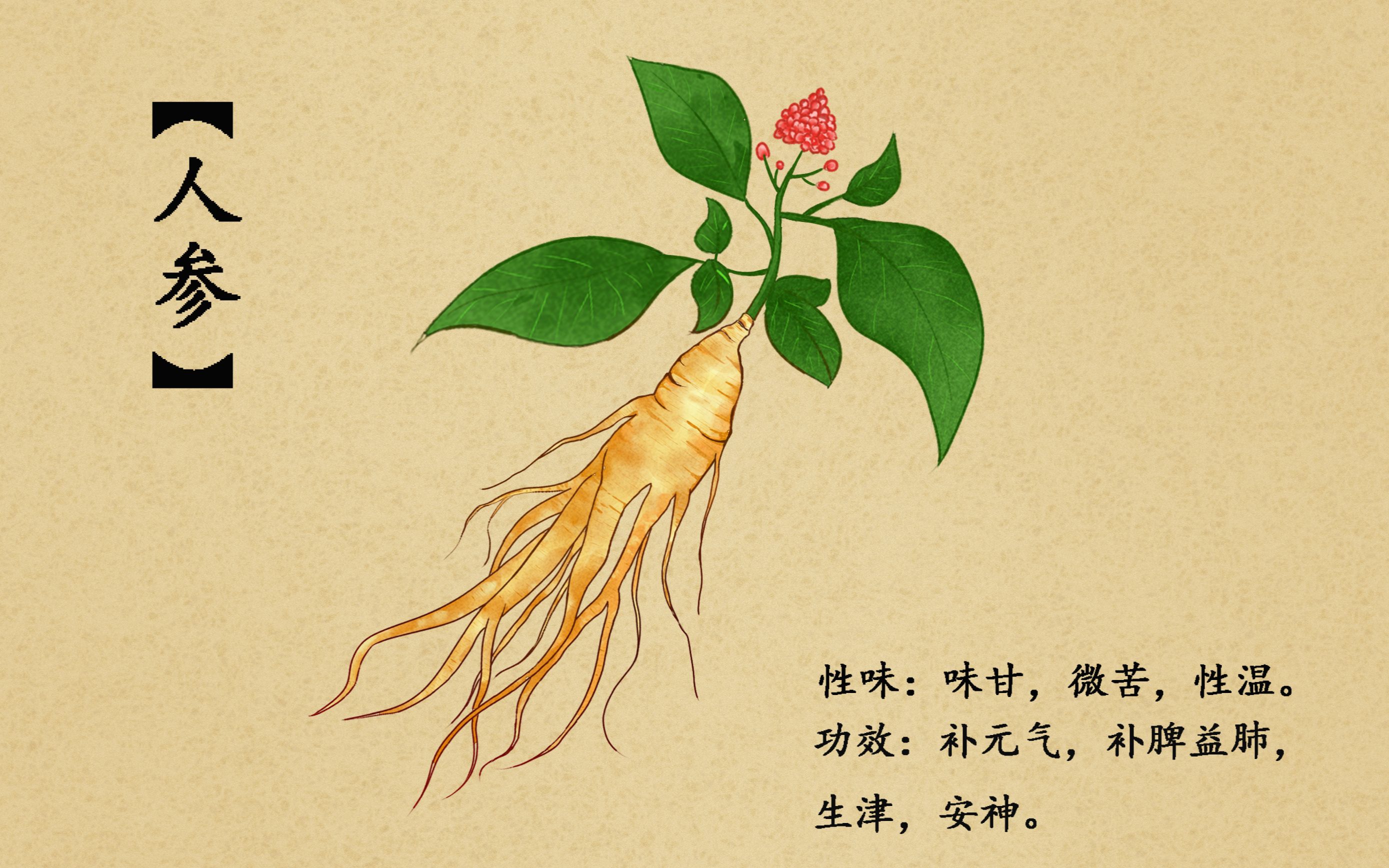 人参大补元气,复脉固脱,是拯危救脱的要药;能够补肺脾心肾气,治疗各种气虚证,还能够生津止渴,安神益智。