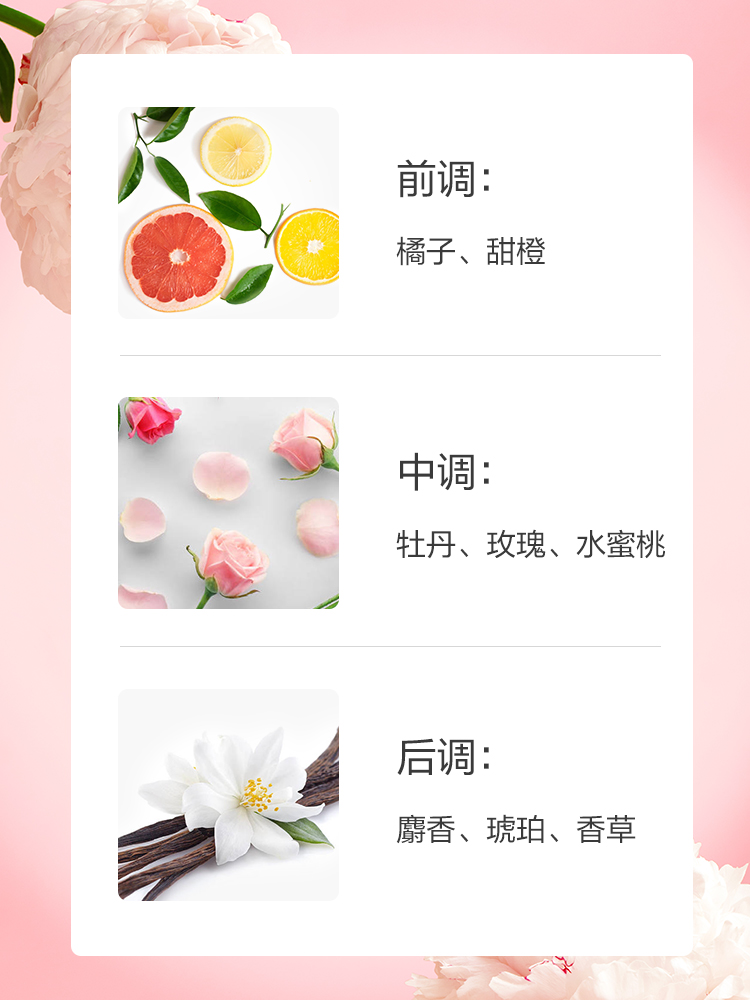 愉悦的感受,清新牡丹同浓郁大马士革玫瑰的辉映中再度升华。萃取前千百株玫瑰精华,封存入瓶,还原最为本真的玫瑰丽影。混合着鲜美欲滴的水蜜桃甜香,丝丝甜意沁入肌理。