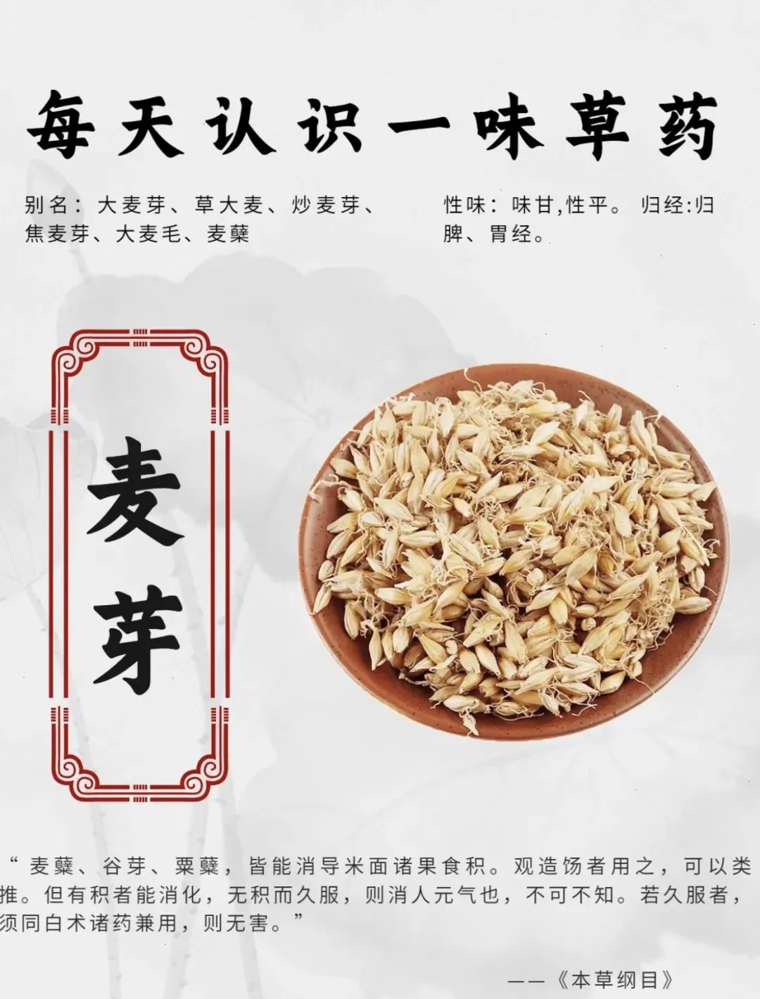 ✅麦芽:麦香浓郁,颗粒饱满,性甘、味平、入脾胃经,具有行气消食,健脾开胃等功效。