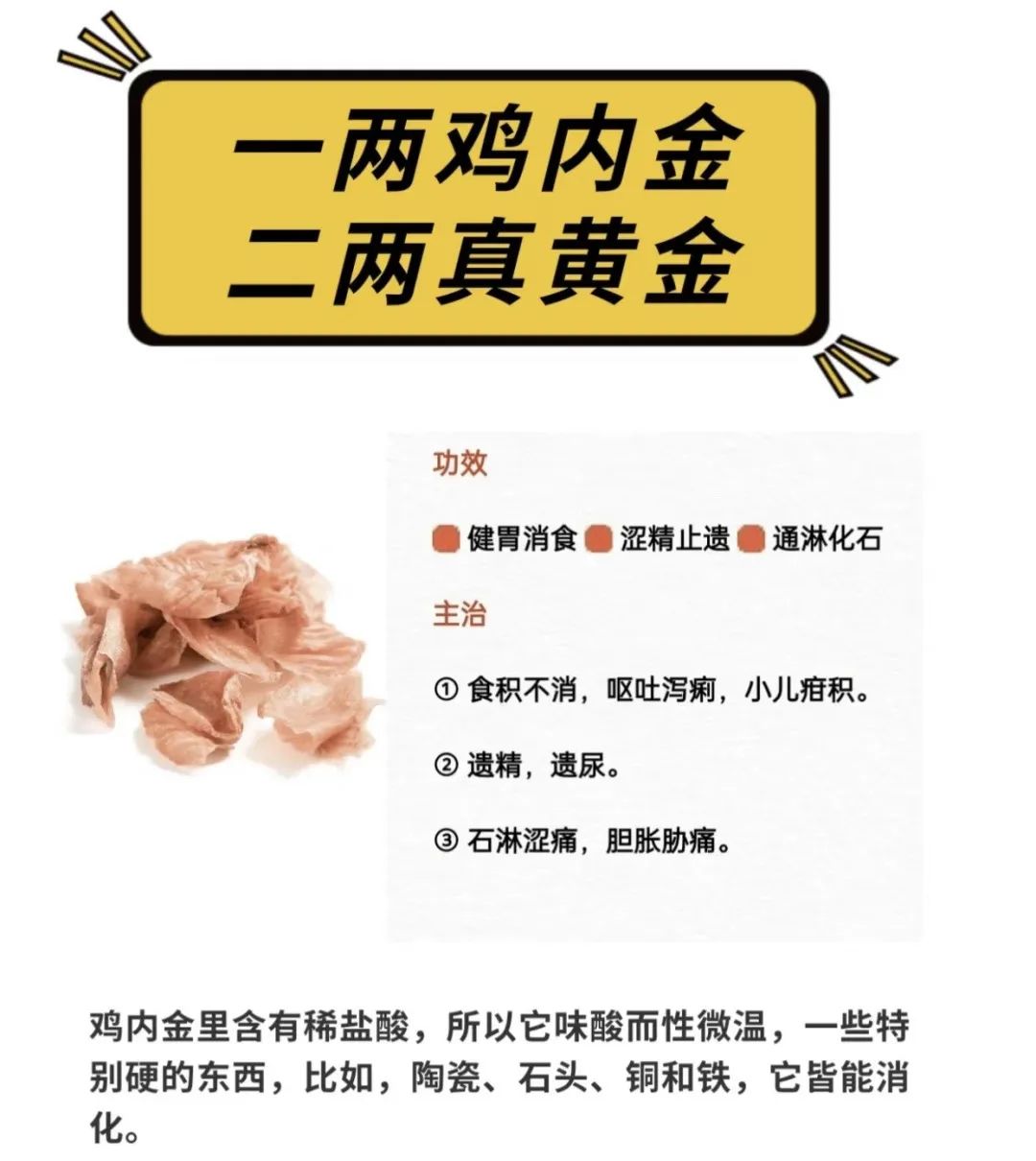✅鸡内金:鸡内金是一种中药材,具有消食健胃,涩精止遗的功效,日常入药可以辅助饮食积滞,小儿疳积,能够消食化积、健运脾胃