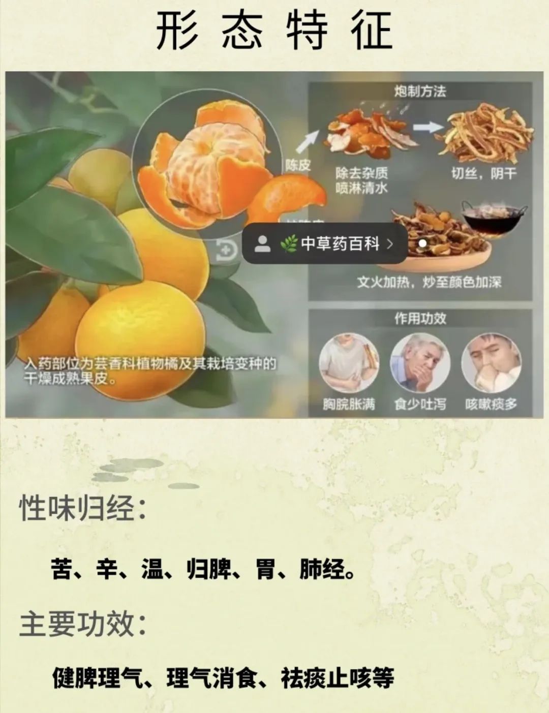 《本草纲目》记载:陈皮有三大类作用,一导胸中寒邪,二破滞气,三益脾胃。
